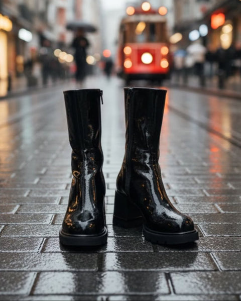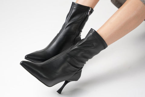 Siyah Streç Bot Kadın İnce Topuk Fermuarlı Rahat Günlük Şık Kombinler İçin Vegan Topuklu Bot