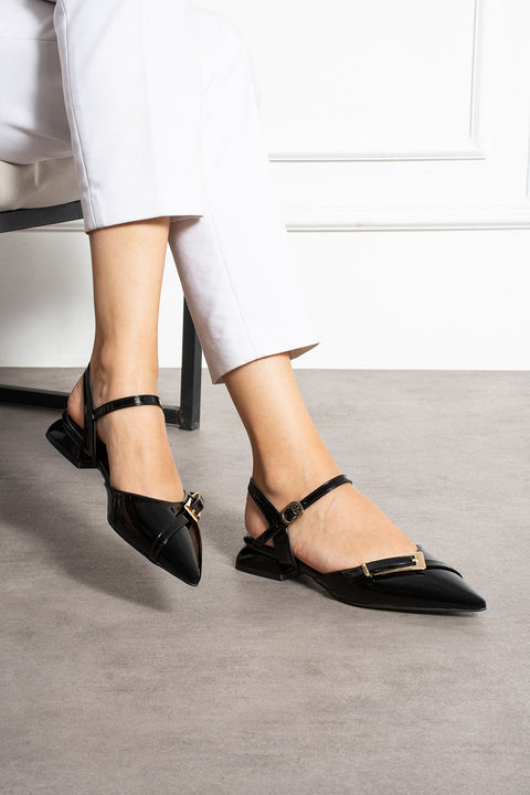 Siyah Rugan Bilekten Bağlamalı Altın Tokalı Sivri Burun Düşük Topuk Kadın Babet Ayakkabı