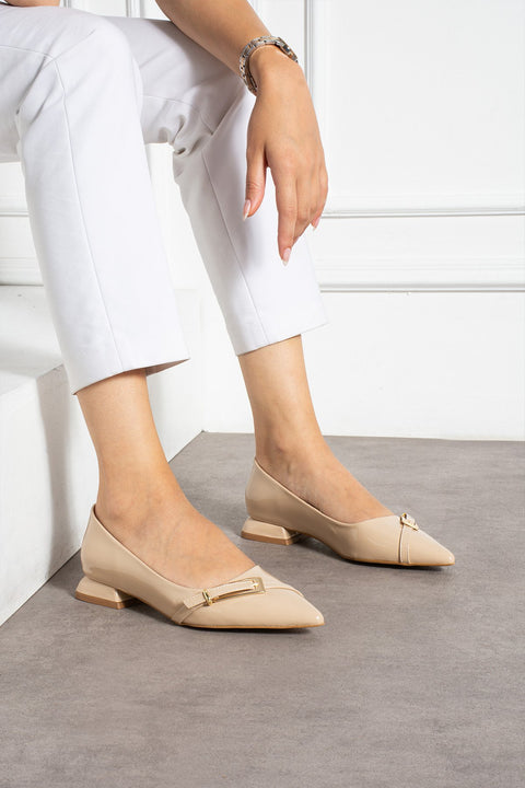 Bej Rugan Bilekten Bağlamalı Çift Gümüş Tokalı Sivri Burun Düşük Topuk Kadın Babet Ayakkabı