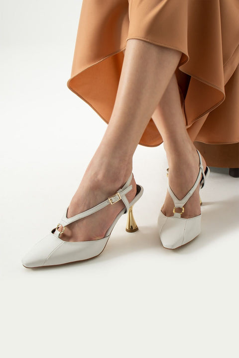 Beyaz Rugan Altın Detaylı Sivri Burun İnce Topuklu Kadın Stiletto | Şık Gece ve Ofis Ayakkabısı