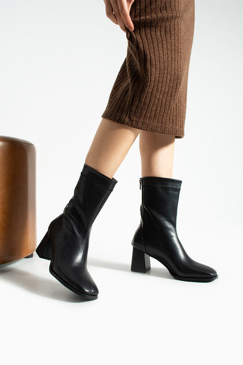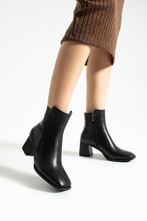Siyah Suni Deri Kısa Bilekli Topuklu Bot – Kalın Topuklu Fermuarlı Şık Günlük Kadın Ayakkabı