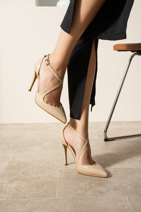 Parlak Bej Stiletto |Vegan Deri,7cm Topuklu, Bilekten Bantlı,Tokalı Sivri Burun Şık Topuklu Ayakkabı