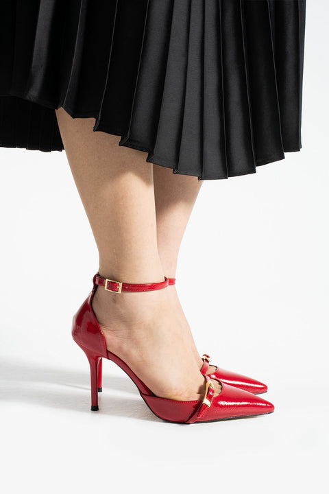Kırmızı Parlak Kırışık Vegan Deri Stiletto – 9cm İnce Topuklu Sivri Burun Şık Kadın Ayakkabı