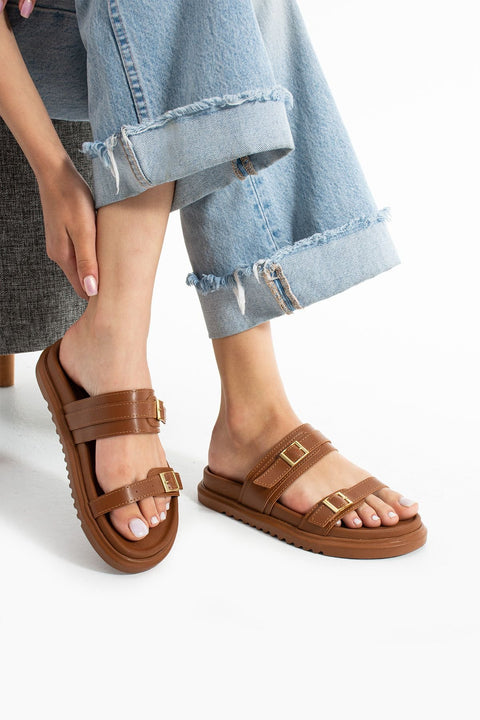Taba Rengi Vegan Deri Üç Altın Tokalı Kadın Terlik |Ortopedik ve Altın Detaylı Yazlık Model