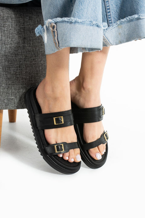 Siyah Vegan Deri Üç Altın Tokalı Kadın Terlik |Ortopedik ve Altın Detaylı Yazlık Model