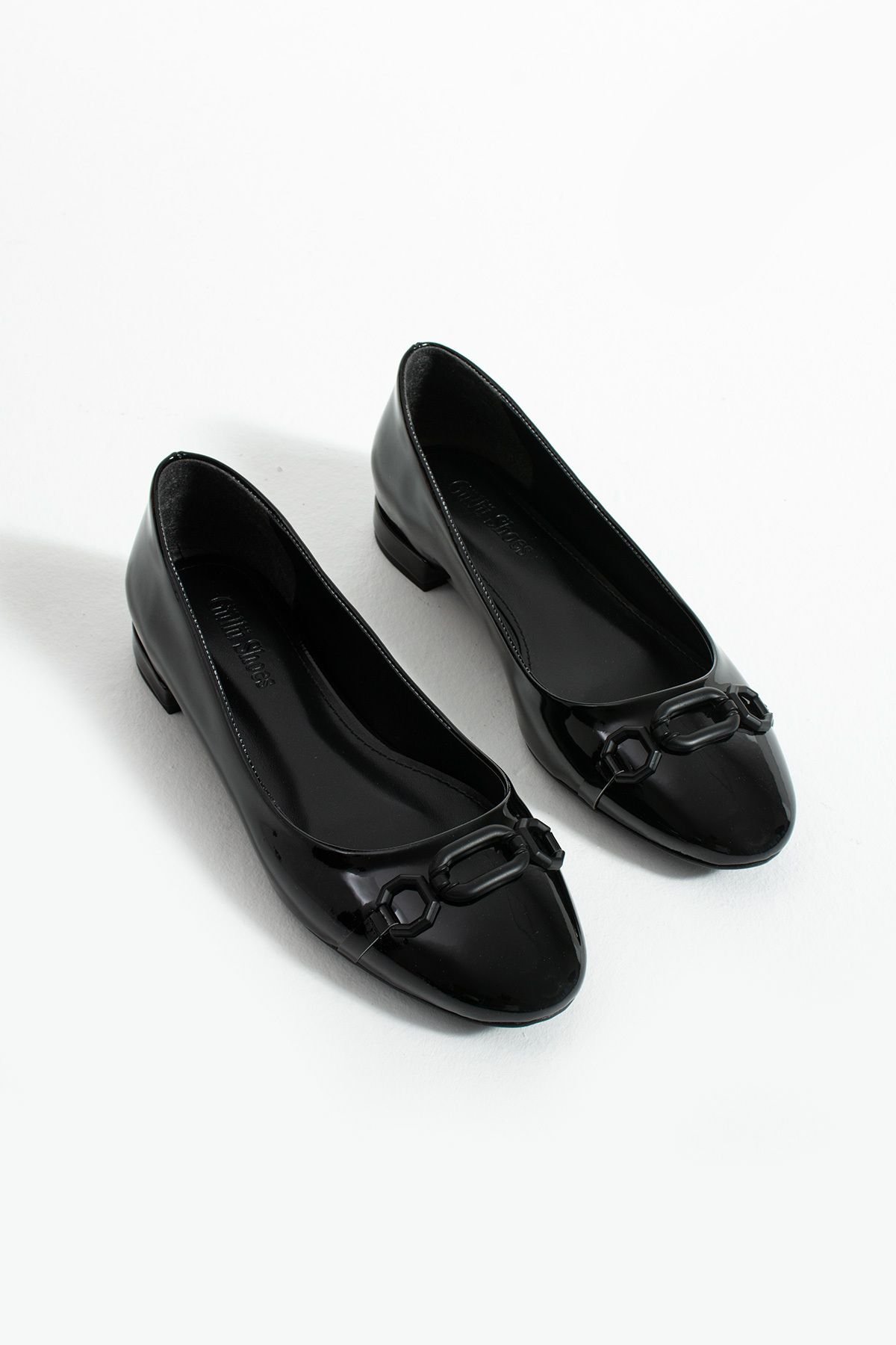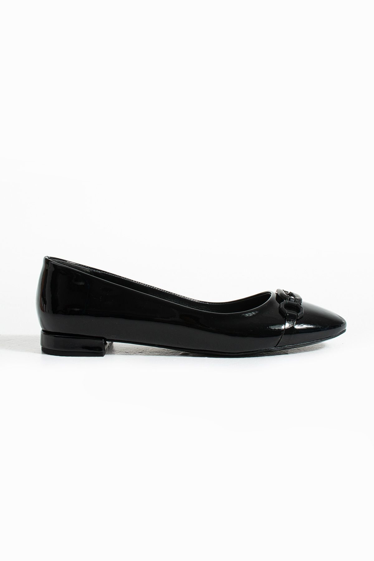 Siyah rugan zincir tokalı kadın babet, klasik babet formunu modern detaylarla birleştirerek şıklık ve konforu aynı potada sunuyor.