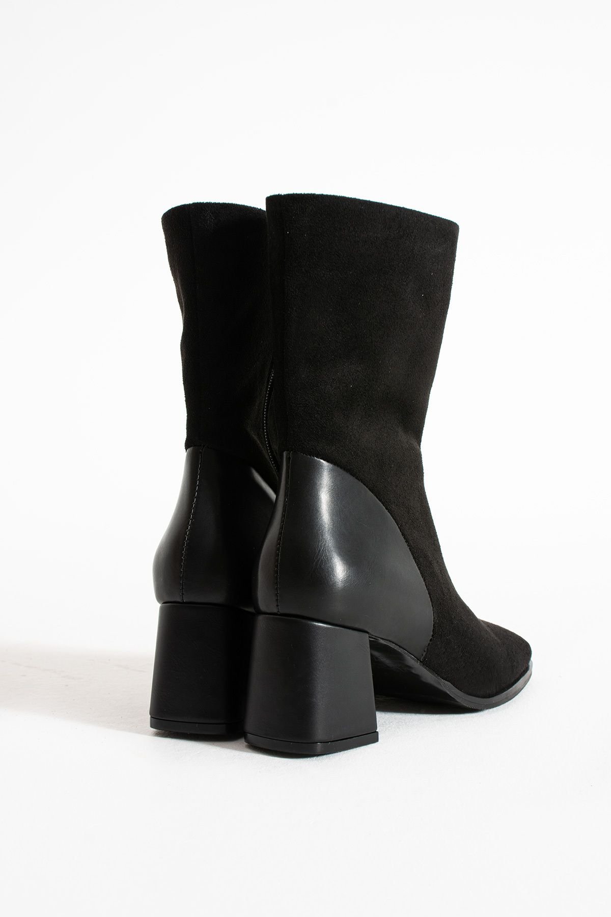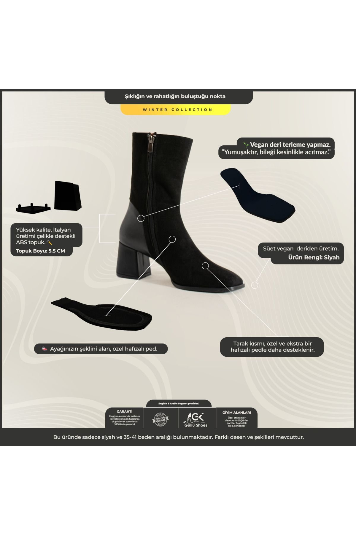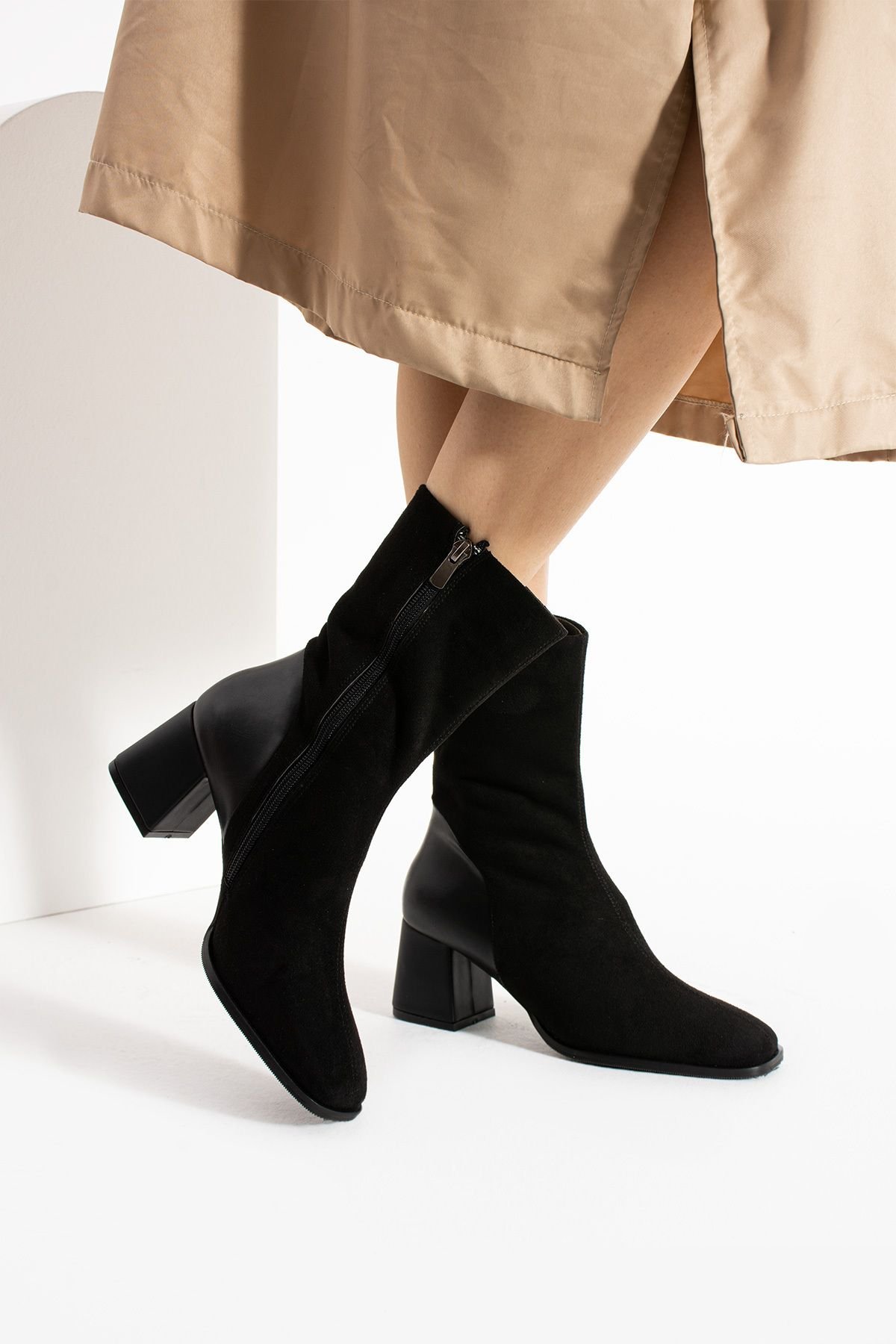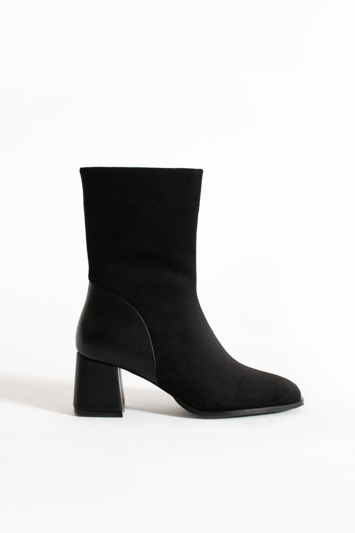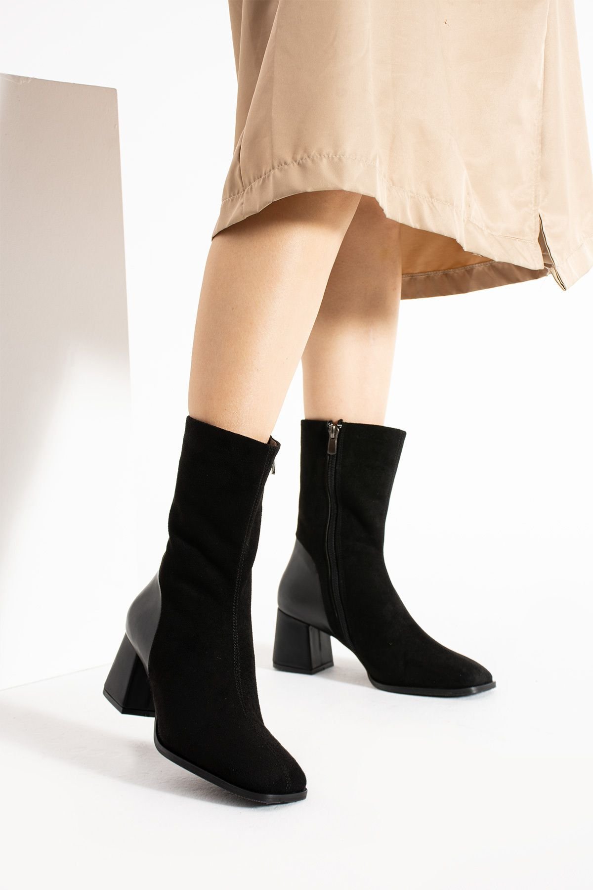 Siyah süet ve deri detaylı kışlık kadın bot, hem fonksiyonel hem stil sahibi bir alternatif arayan kadınlar için tasarlandı.