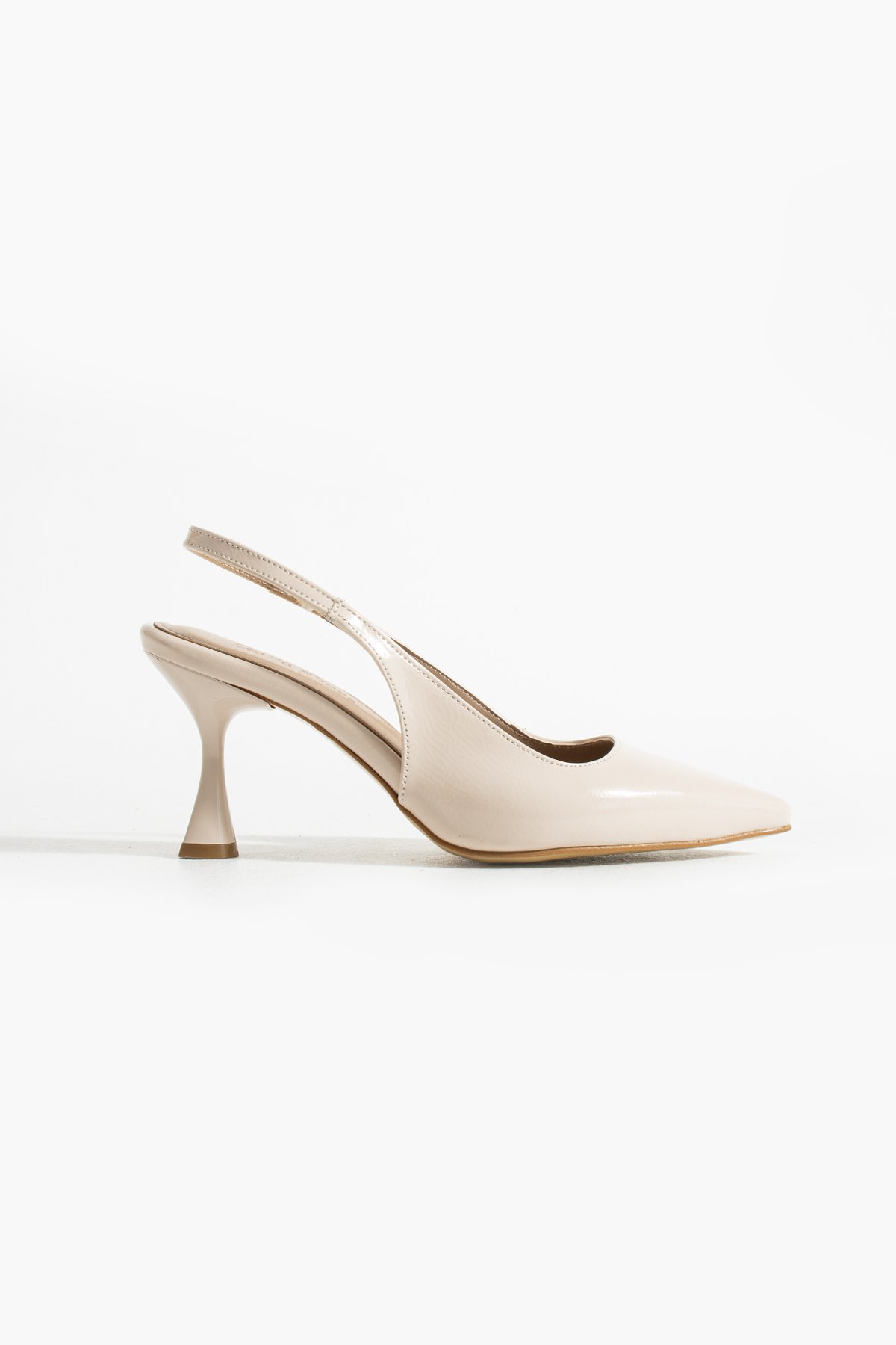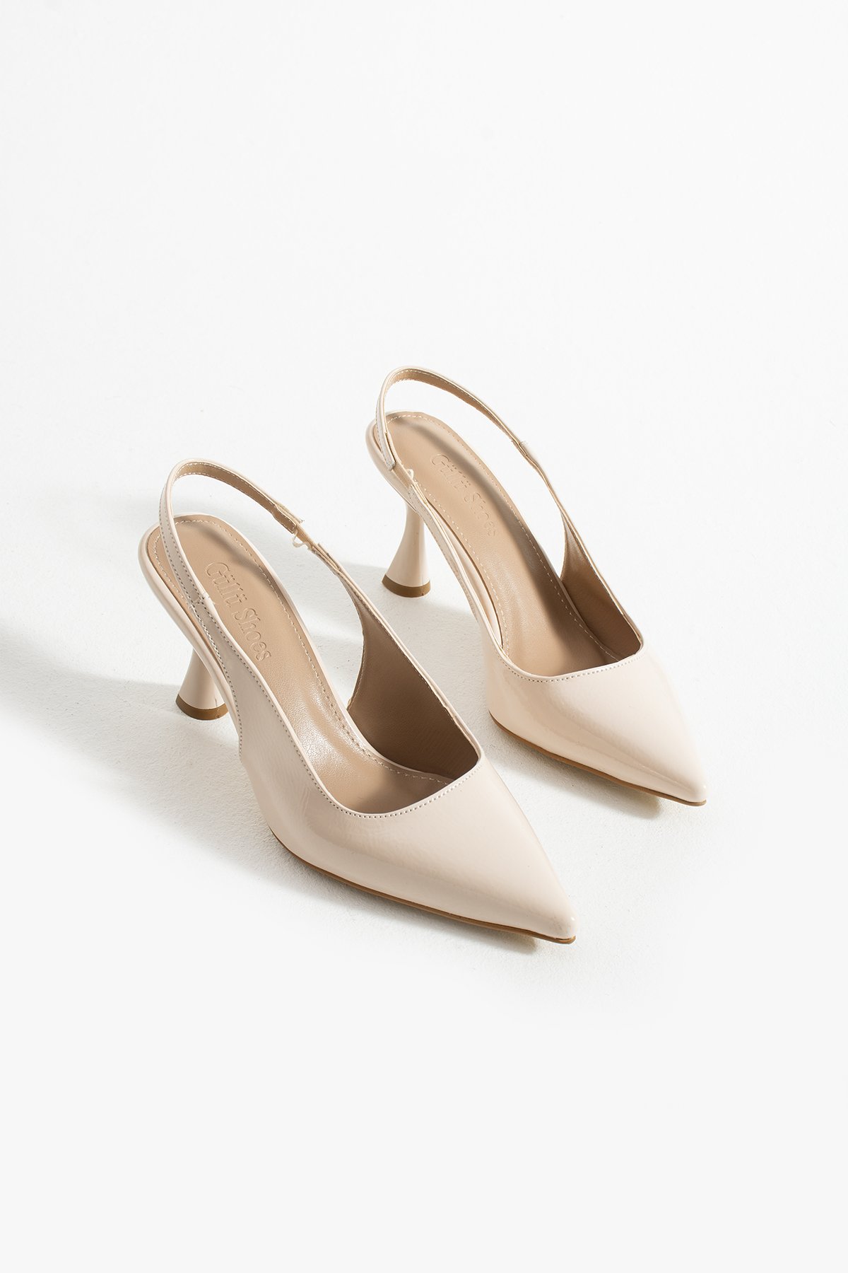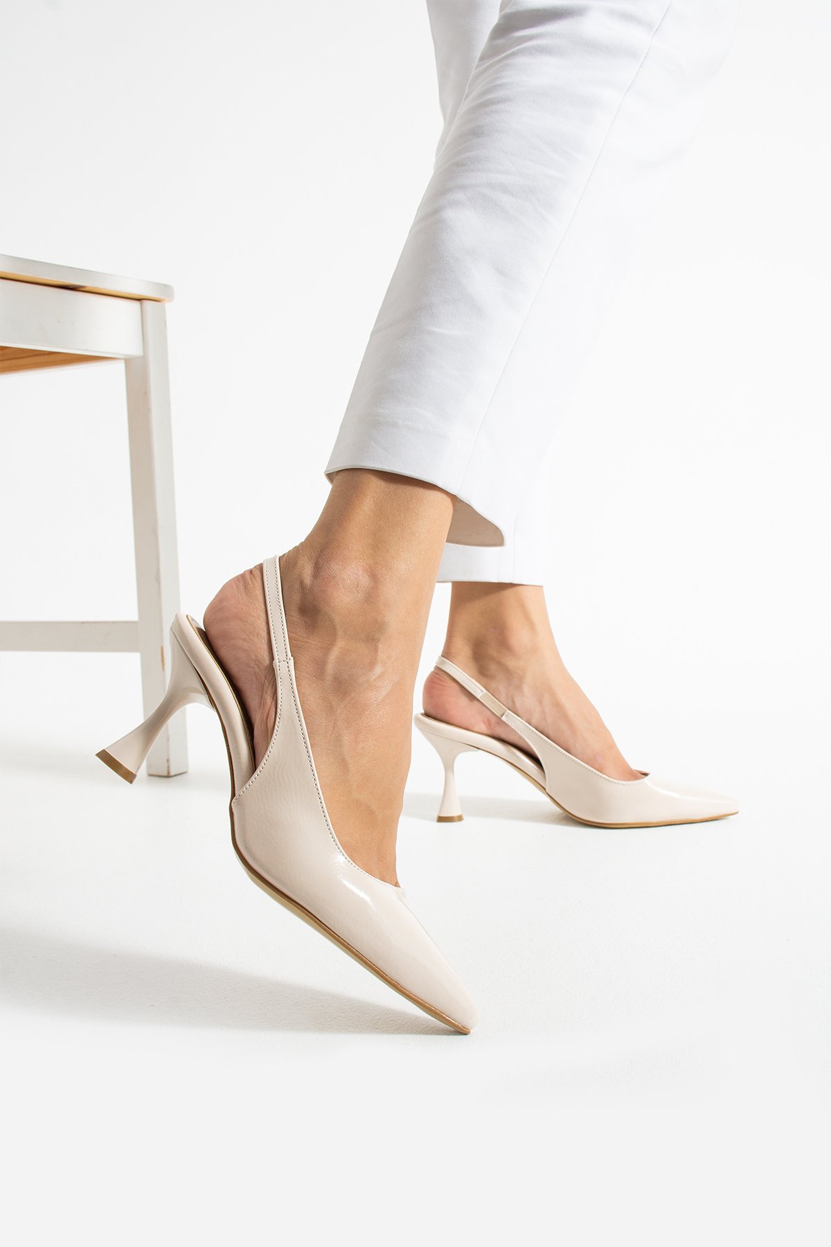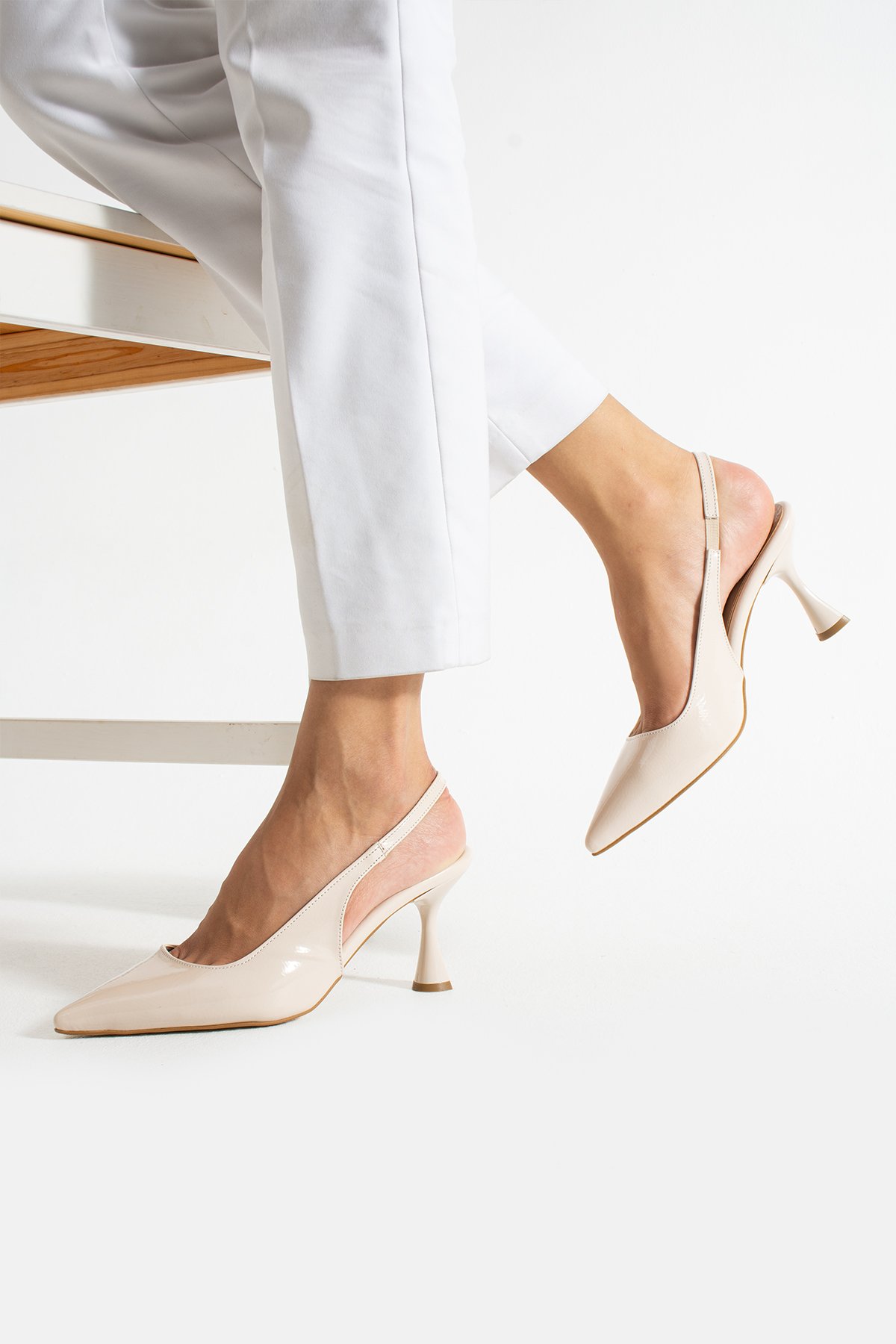 Bej rengi sayesinde farklı renk kombinasyonlarına kolayca uyum sağlayan bu klasik topuklu ayakkabı, abiye elbiselerden takım elbiselere kadar birçok stile rahatlıkla eşlik eder.