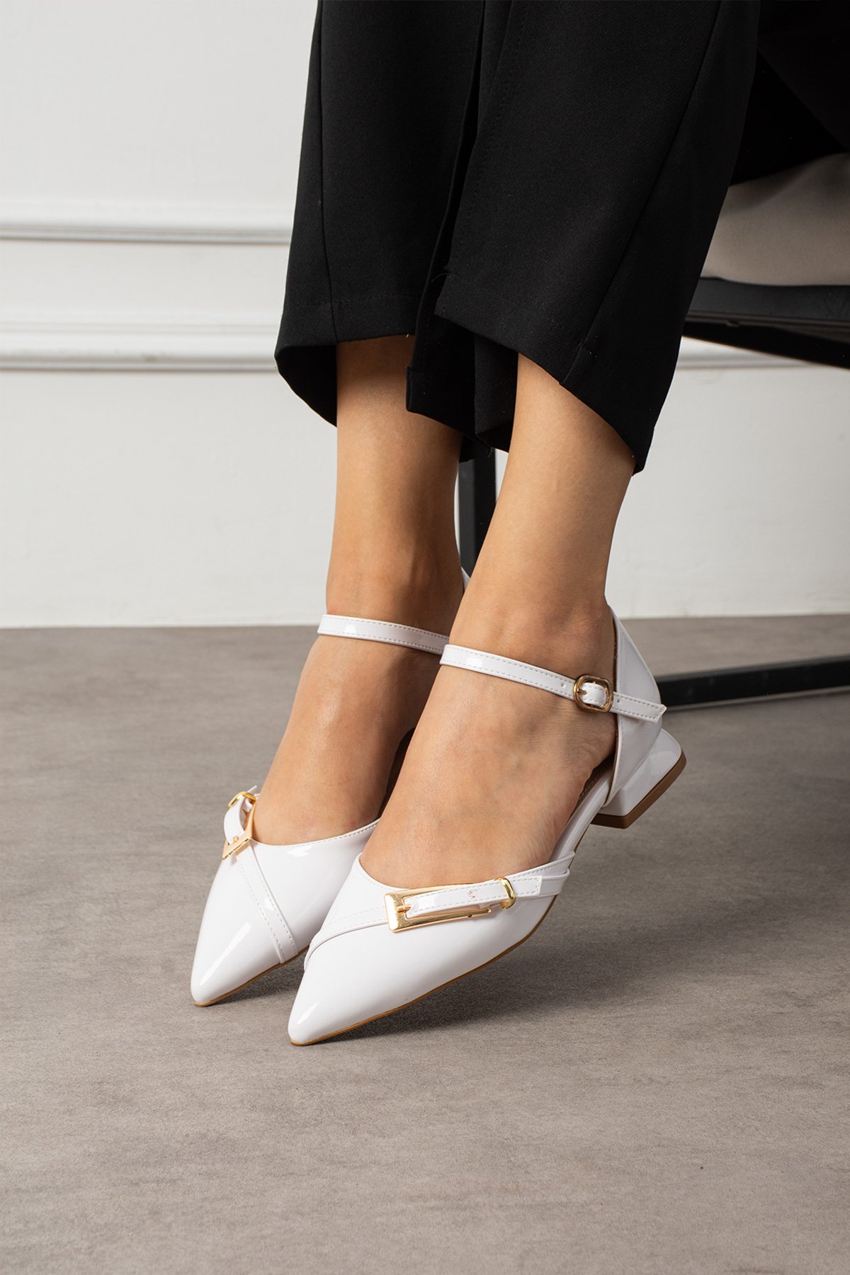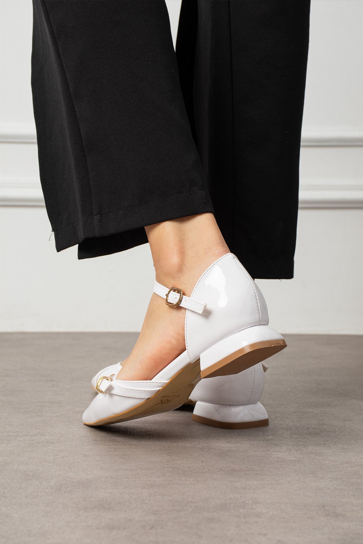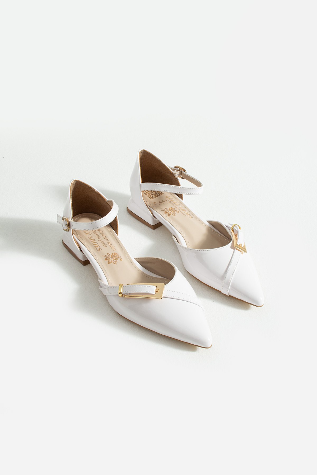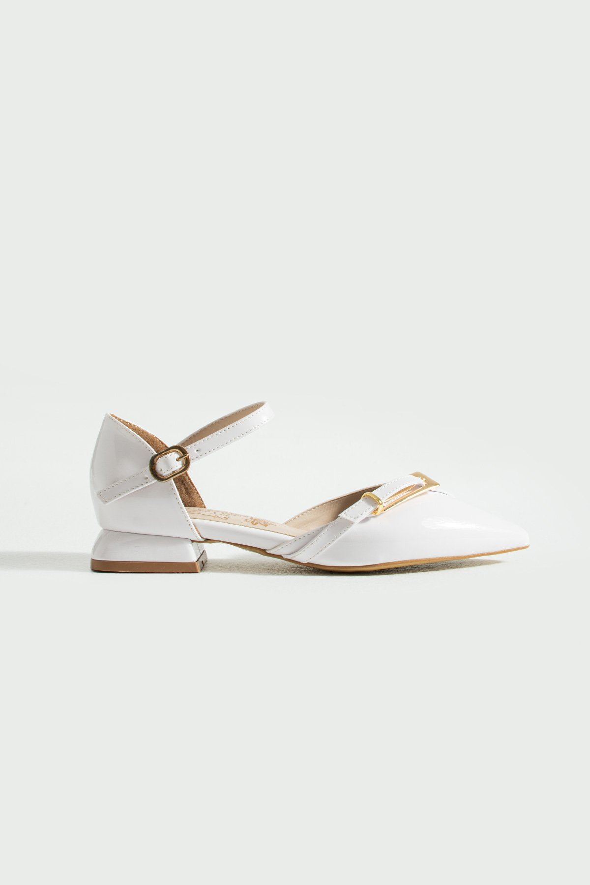 Beyaz Rugan Bilekten Bağlamalı Altın Tokalı Sivri Burun Düşük Topuk Kadın Babet Ayakkabı