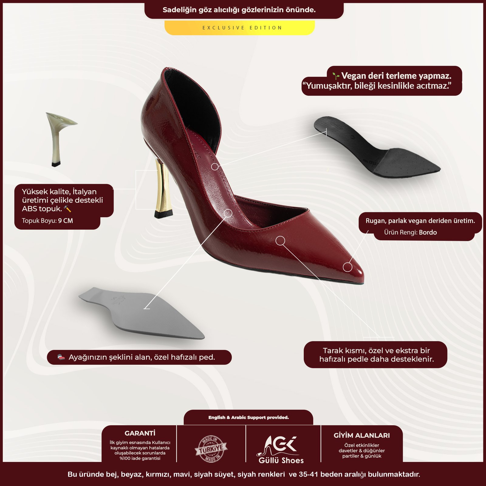 ✓ Renk & Malzeme: Bordo vegan suni deri; güçlü, şık ve sofistike bir görünüm sunan bordo kadın topuklu ayakkabı stilini tamamlar.