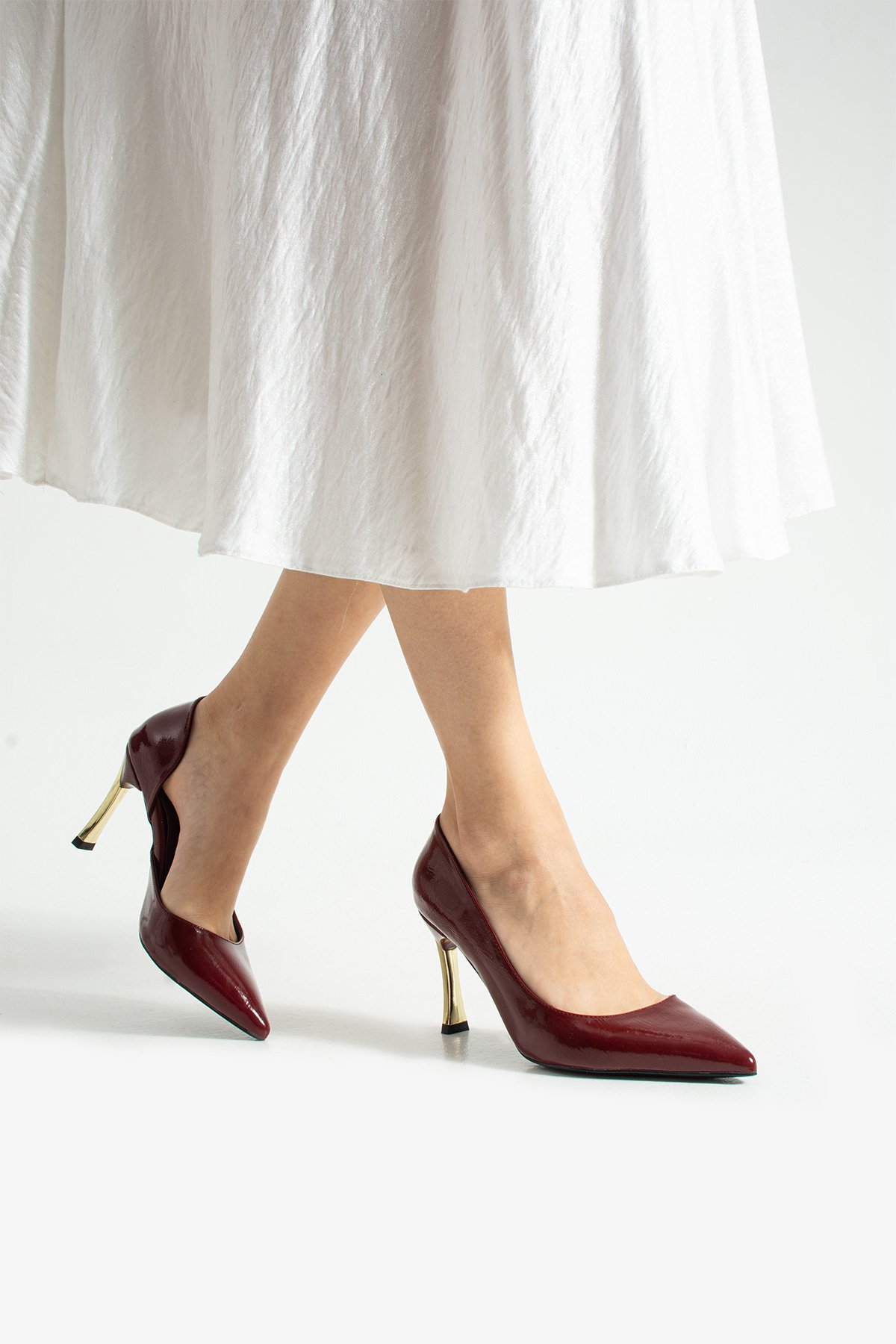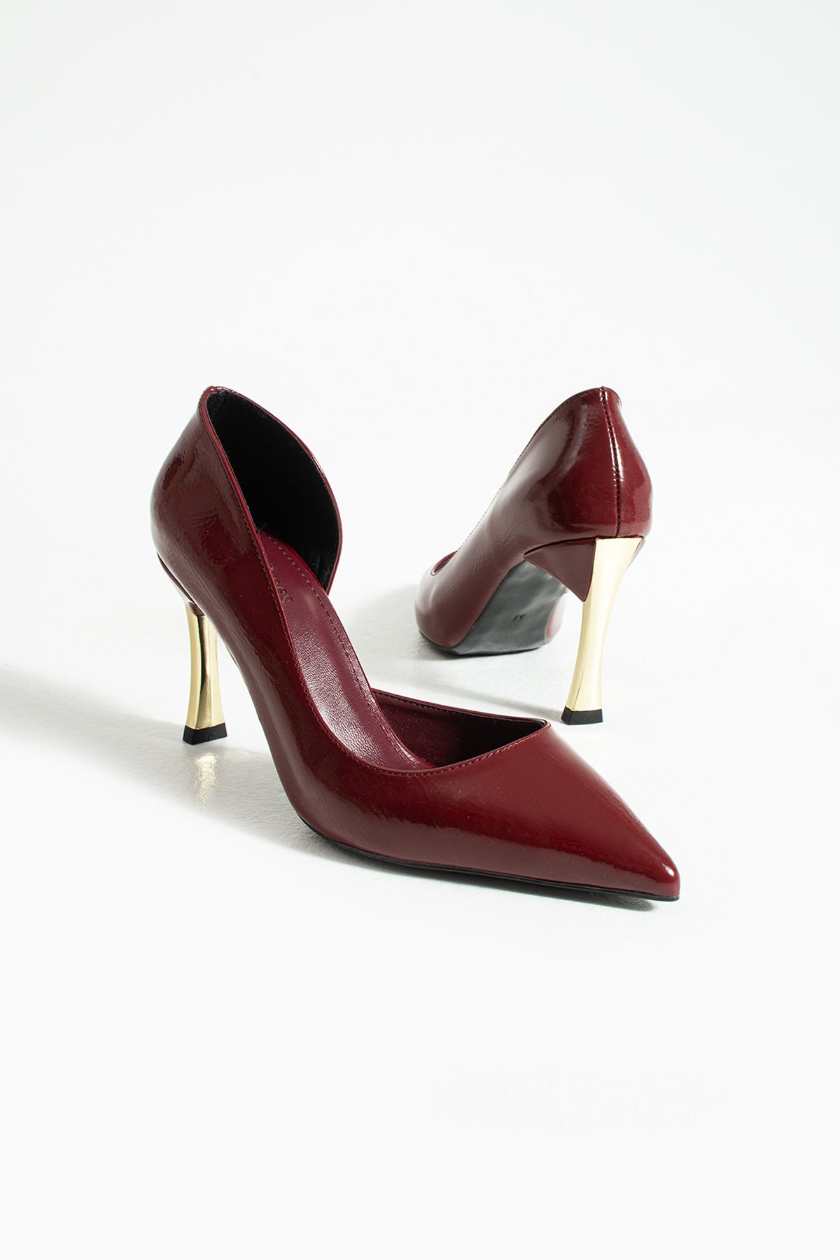Bordo Rugan 9 Cm Altın Kaplama Kadın Topuklu Stiletto Ayakkabı Vegan Deri Günlük ve Özel Gün