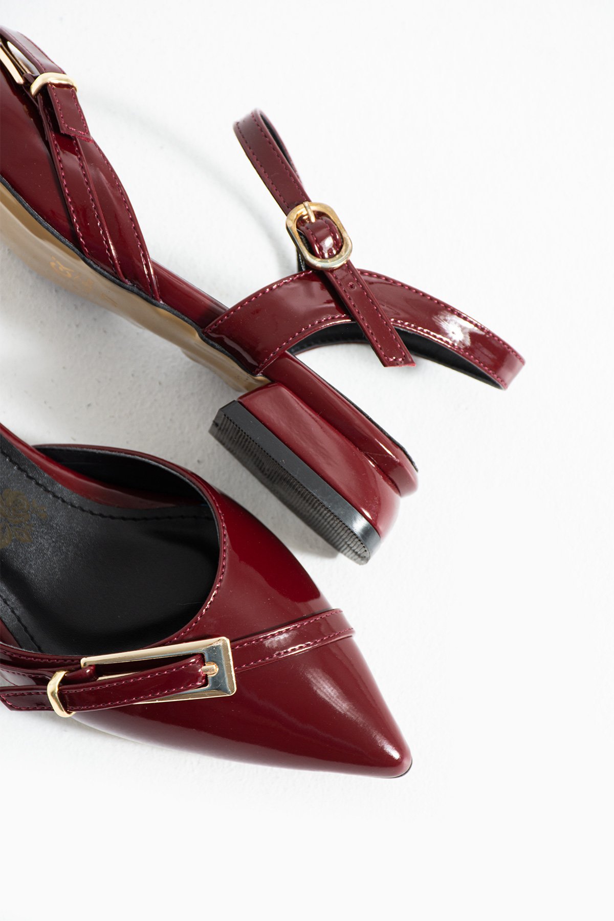 Bordo Rugan Altın Tokalı Bilekten Bağlamalı Sivri Burun Düşük Blok Topuk Kadın Babet Ayakkabı