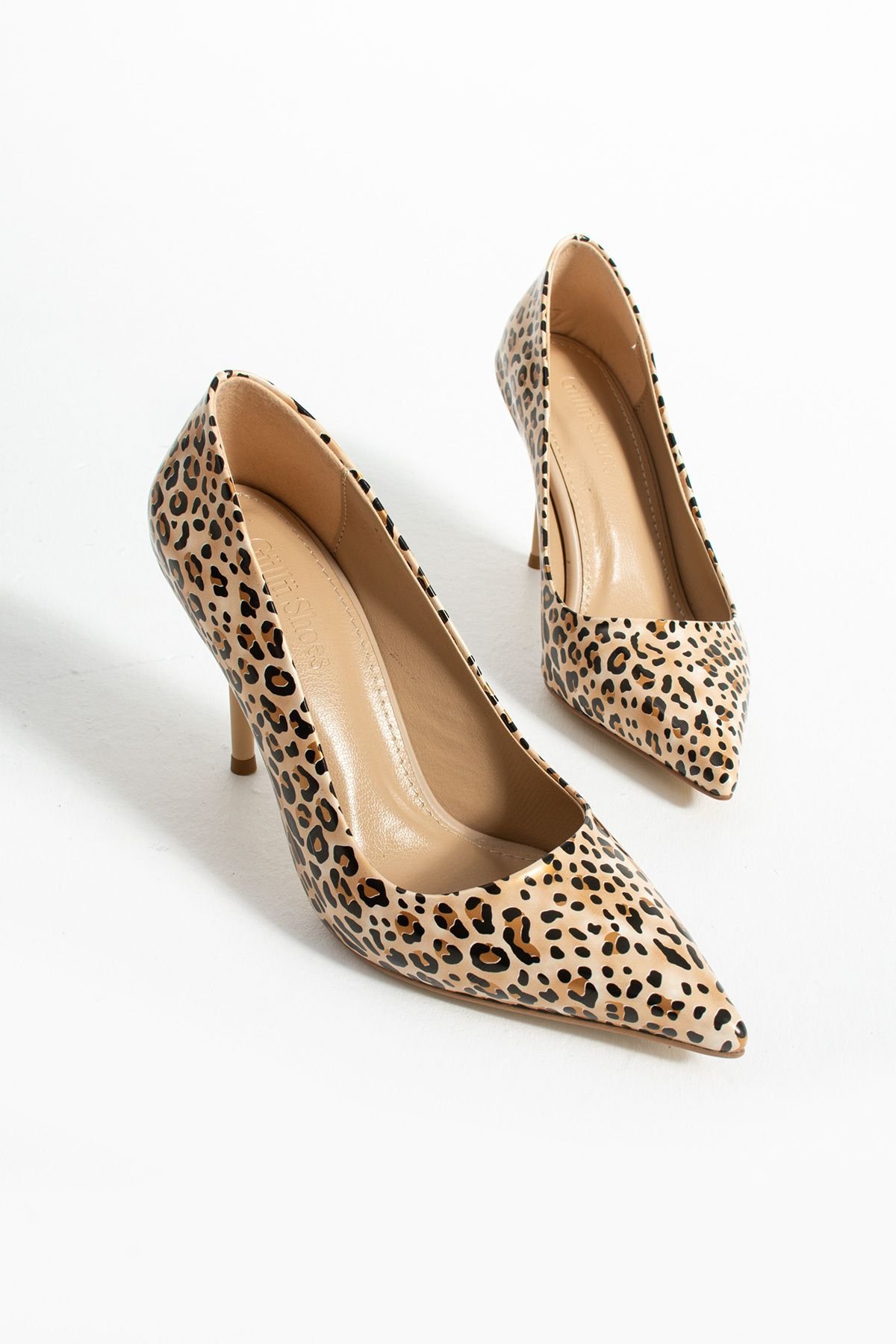 Bej Leopar Desenli Rugan Görünümlü Stiletto – İnce Topuklu, Sivri Burunlu, Rahat ve Şık Kadın Ayakkabı | Ofis ve Özel Gün Uyumlu