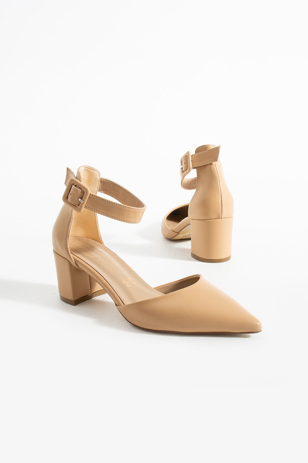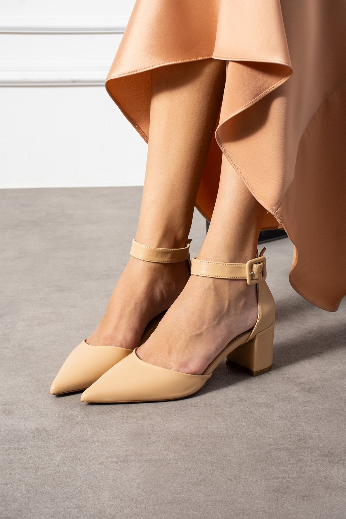 Kadın Nude Kalın Topuklu Bilekten Bağcıklı Sivri Burun Klasik Günlük ve Abiye Ayakkabı