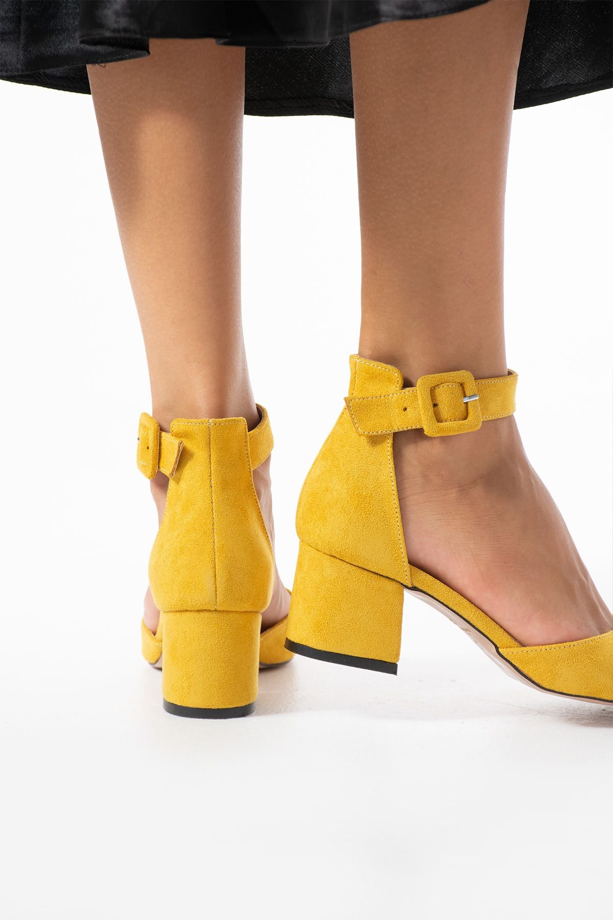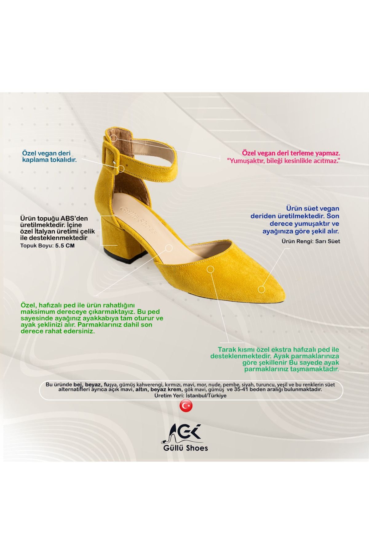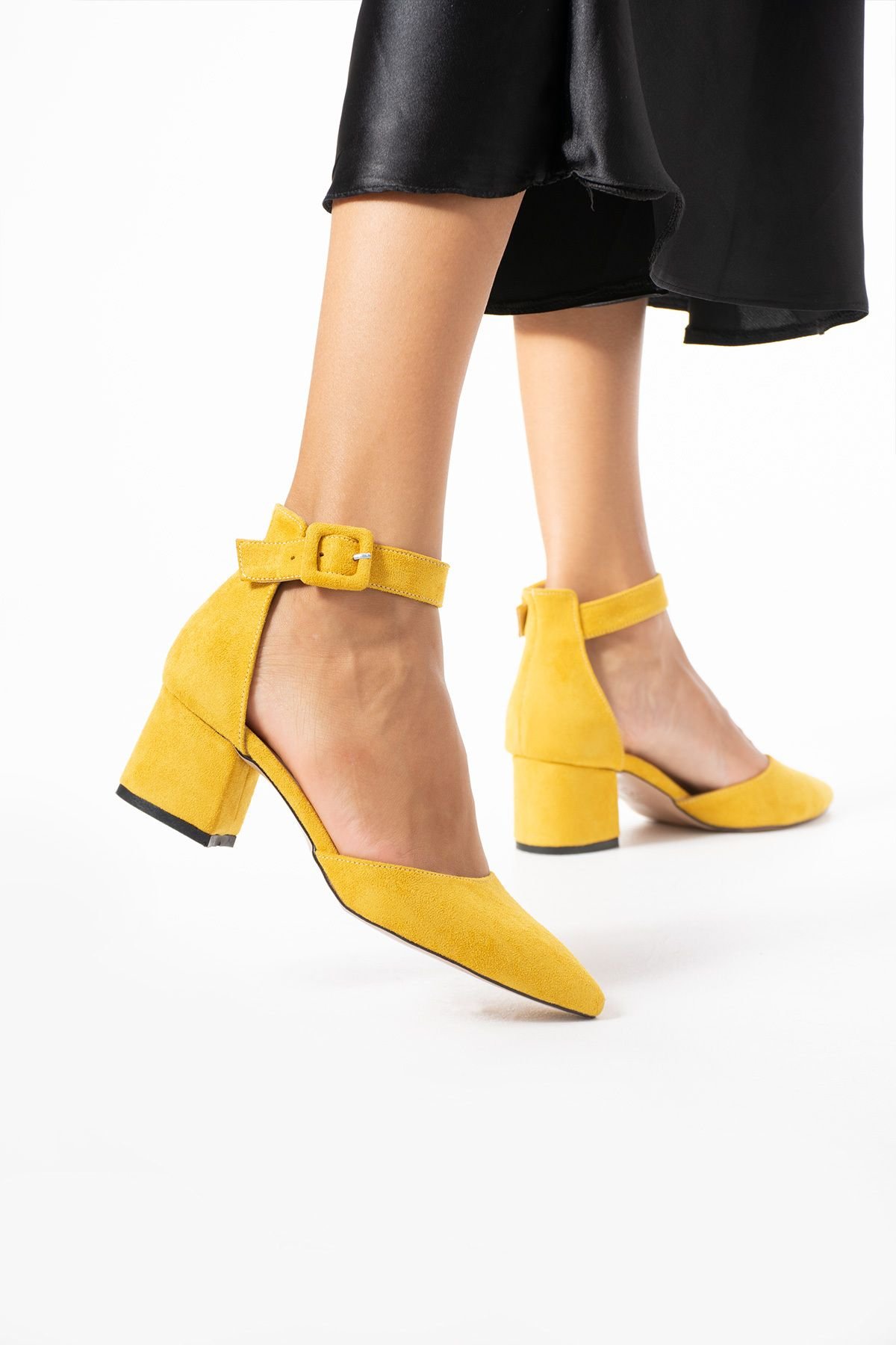 Kadin Sarı Süet Ayakkabı Abiye Stiletto Kalın Topuk Gelinlik Ayakkabisi 5.5cm