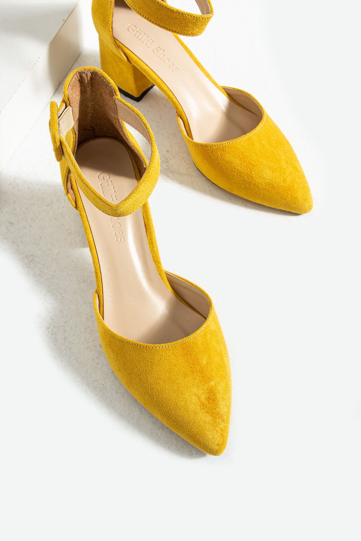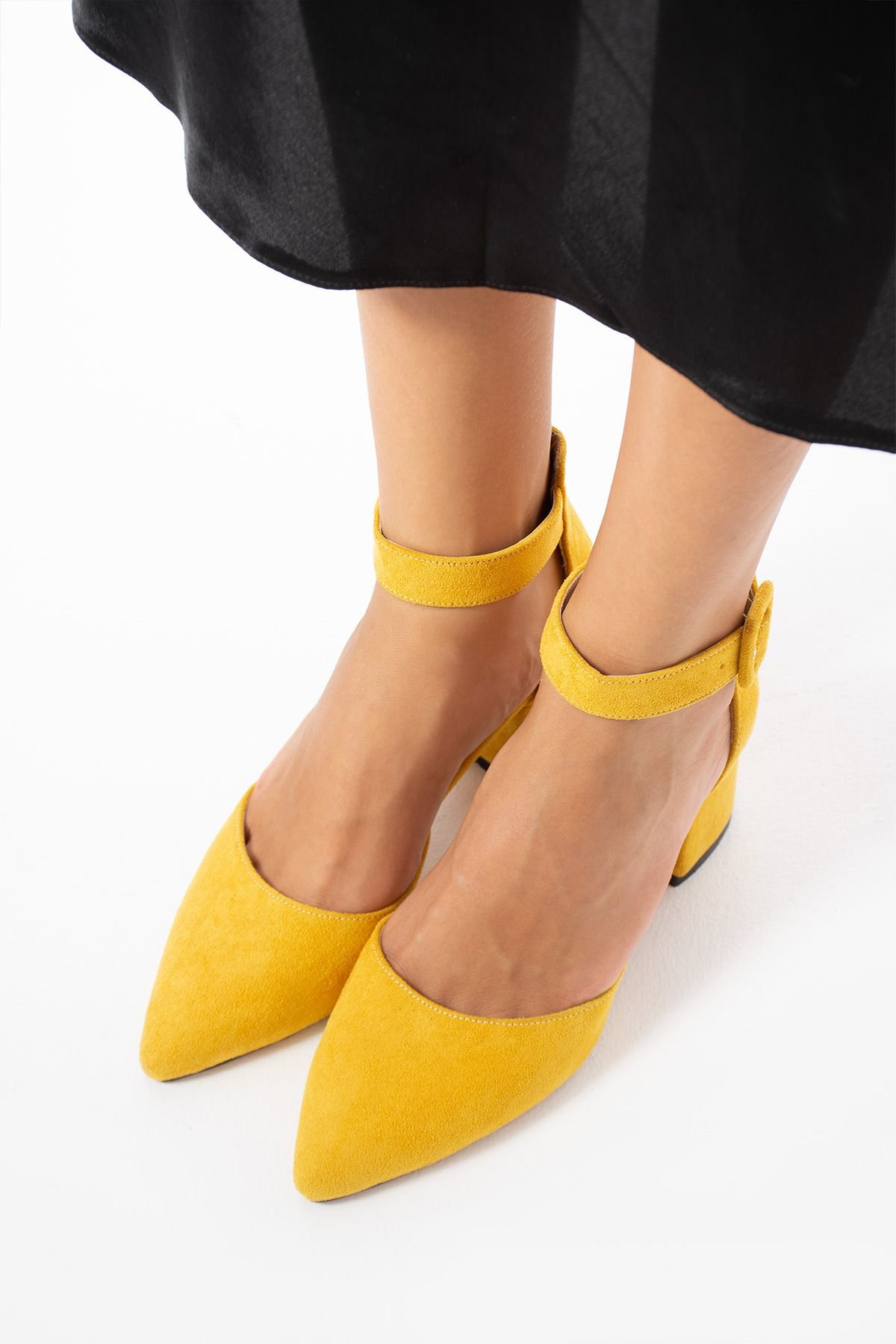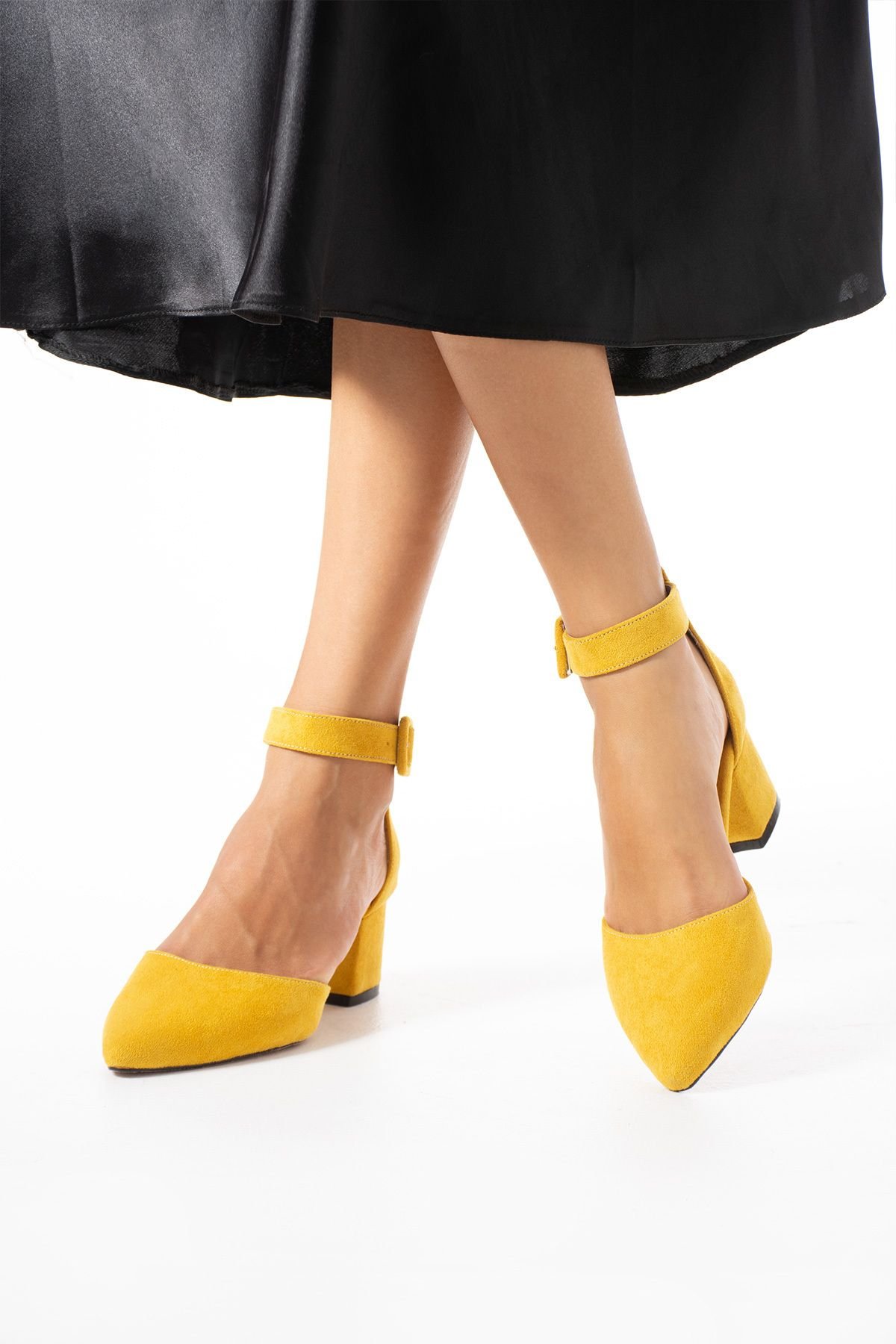 Kadin Sarı Süet Ayakkabı Abiye Stiletto Kalın Topuk Gelinlik Ayakkabisi 5.5cm