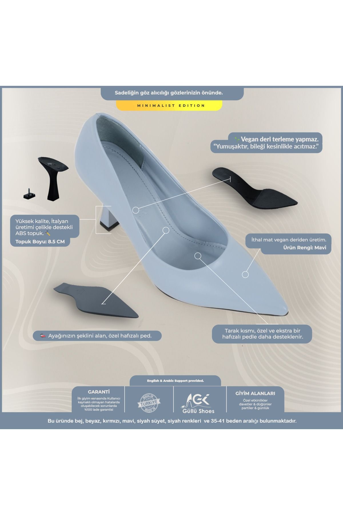 Stiletto Topuklu Ayakkabı:İnce ve uzun topuk yapısı, şıklığı ve zarafeti bir arada sunar.; Kadın Abiye Ayakkabı:Düğün, davet ve özel gecelerde şıklığınızı tamamlar.; Mat Kaplama: Zarif ve modern bir görünüm sunar, hem abiye hem de günlük kombinler için mükemmel bir tercih.; Vegan Deri Ayakkabı:Çevreye duyarlı kadınlar için doğa dostu malzemelerden üretilmiştir.; Günlük Topuklu Ayakkabı:Rahat yapısı sayesinde gün boyu konfor sağlar, şıklığından ödün vermeden kullanabilirsiniz.; Düğün Ayakkabısı:Özel günlerinizde, zarif duruşu ve rahat yapısıyla size eşlik eder.; Açık Mavi Kadın Stiletto:Her kıyafetle uyumlu, çok yönlü bir ayakkabı olarak gardırobunuzun vazgeçilmezi olur.; Topuk Yüksekliği:8,5Cm.; Açık mavi stiletto, kadın modasında zamansız bir klasik olarak kabul edilen ve her kadının gardırobunda mutlaka bulunması gereken bir stiletto topuklu ayakkabı modelidir.; Bu gök mavi stiletto, zarif bir duruş sağlarken, ince topukları sayesinde kadınların ayaklarını daha uzun ve ince gösterir.; Kadın abiye ayakkabı kategorisinde, özellikle gök mavi stiletto modelleri, hem şıklığı hem de rahatlığı bir arada sunarak özel gecelerde, davetlerde ve düğünlerde kadınların ilk tercihi olmaktadır.; Abiye topuklu ayakkabı arayışında olanlar için ideal bir seçenek olan bu gök mavi kadın stiletto, kombinlerinizi tamamlayarak göz alıcı bir görünüm elde etmenizi sağlar.; Stiletto topuklu ayakkabı, özellikle abiye ve günlük kombinlerde sıkça tercih edilen bir modeldir.; Gök mavi kadın stiletto, rugan kaplaması ile dikkat çekerken, parlaklığı ve lüks görünümüyle abiye topuklu ayakkabı arayan kadınlar için vazgeçilmez bir alternatiftir.; Gök mavi topuklu ayakkabı, her türlü kıyafetle uyum sağlayan çok yönlü bir seçenek sunarken, vegan deri ayakkabı özelliği sayesinde çevreye duyarlı kadınların da tercihi olmaktadır.; Vegan deri ayakkabı arayanlar için özel olarak tasarlanmış bu gök mavi stiletto, zarafeti ve doğa dostu olmayı bir arada sunar.; Kadın stiletto denildiğinde akla ilk gelen bu model, düğün ayakkabısı olarak da mükemmel bir tercih sunar.; Düğün gibi özel günlerde, hem şıklığı hem de rahatlığı bir arada sunan bu abiye topuklu ayakkabı, gün boyu rahatlıkla kullanılabilecek bir tasarıma sahiptir.; Rugan ayakkabı kaplaması, gök mavi stilettoya ekstra bir parlaklık katarken, stiletto topuklu ayakkabı yapısı sayesinde zarif bir yürüyüş sağlar.; Gök mavi kadın stiletto, hem abiye hem de günlük topuklu ayakkabı olarak kullanılabilecek kadar çok yönlüdür.; Bu gök mavi topuklu ayakkabı, kadın abiye ayakkabı koleksiyonlarının vazgeçilmez bir parçası olarak, stil sahibi kadınların her zaman tercihi olmuştur.; Sonuç olarak, gök mavi sitiletto, kadın stiletto modelleri arasında öne çıkan, şıklığı ve zarafeti bir arada sunan, vegan deri ayakkabı olarak da tercih edilebilecek, rugan ayakkabı parlaklığıyla dikkat çeken, abiye topuklu ayakkabı arayanlar için mükemmel bir seçenek sunan, günlük topuklu ayakkabı olarak da kullanılabilen, düğün ayakkabısı olarak harika bir tercih olan, gök mavi kadın stiletto modelidir.; Gök mavi topuklu ayakkabı, kadın sitiletto arayışında olanların mutlaka göz önünde bulundurması gereken bir modeldir ve bu sitiletto topuklu ayakkabı, her kadının tarzını yansıtan, abiye ve günlük kombinlerde mükemmel uyumu sağlayan bir üründür.