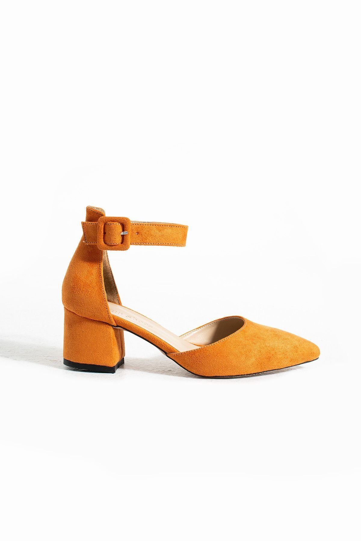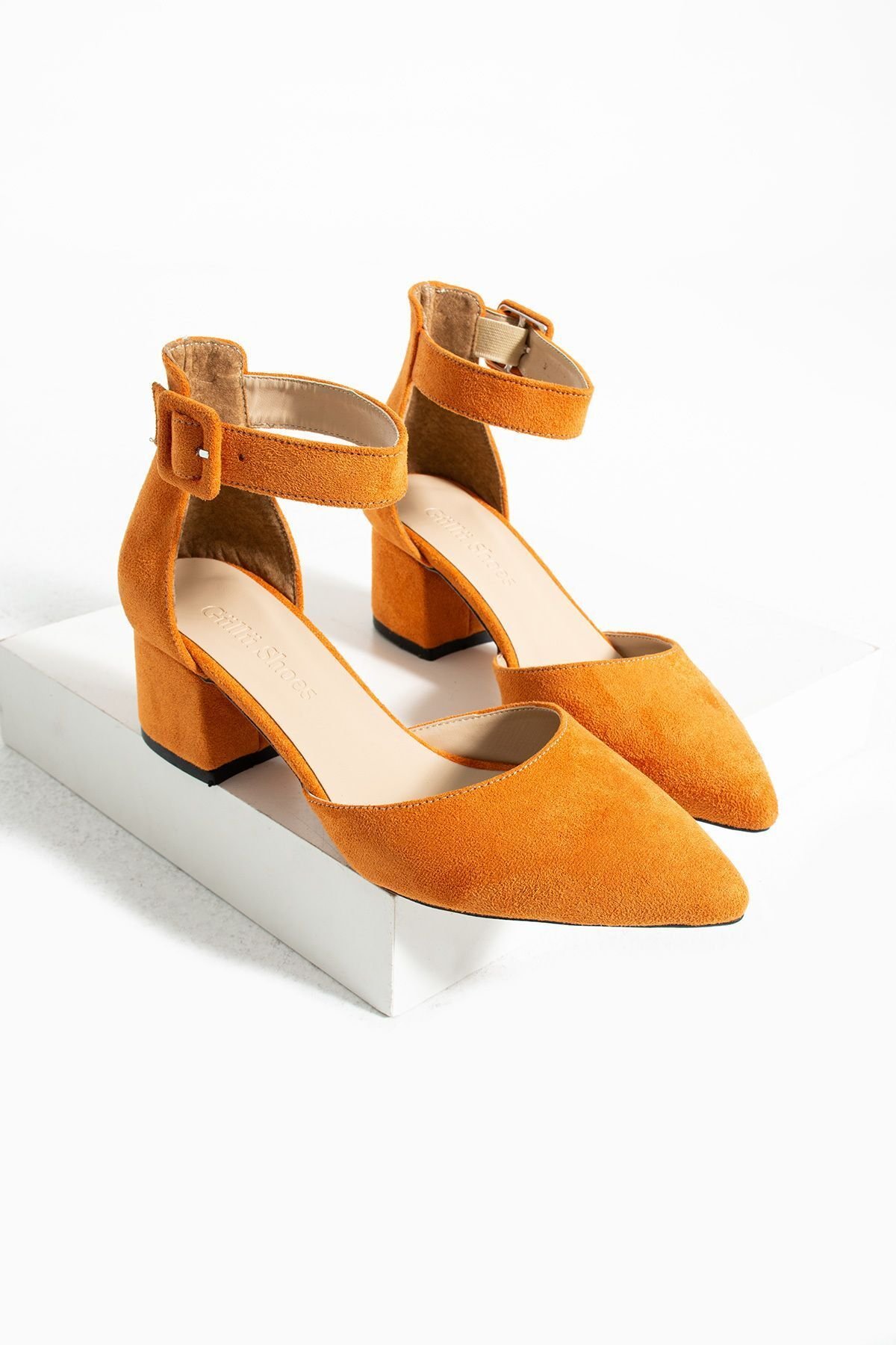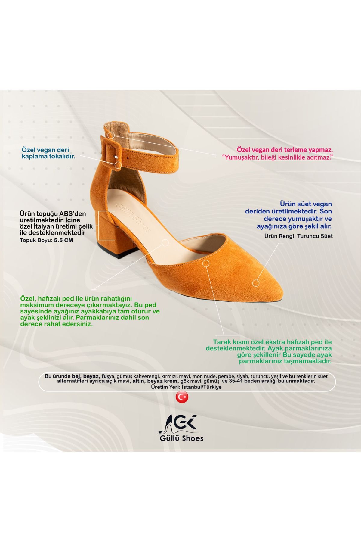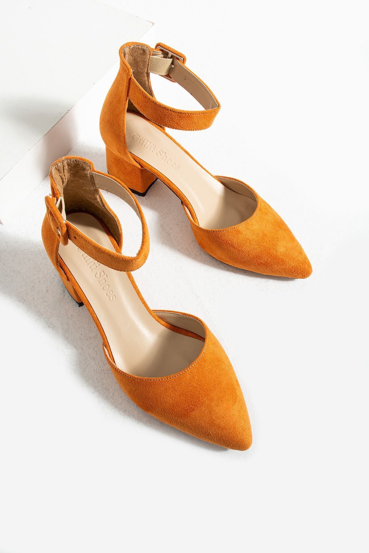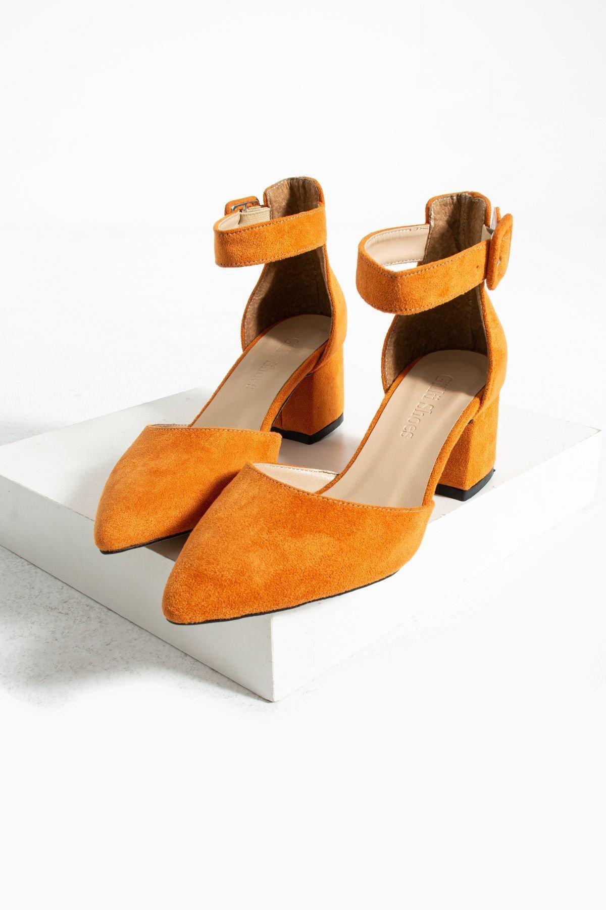 Kadin Turuncu Süet Ayakkabı Abiye Stiletto Kalın Topuk Gelinlik Ayakkabisi 5.5cm