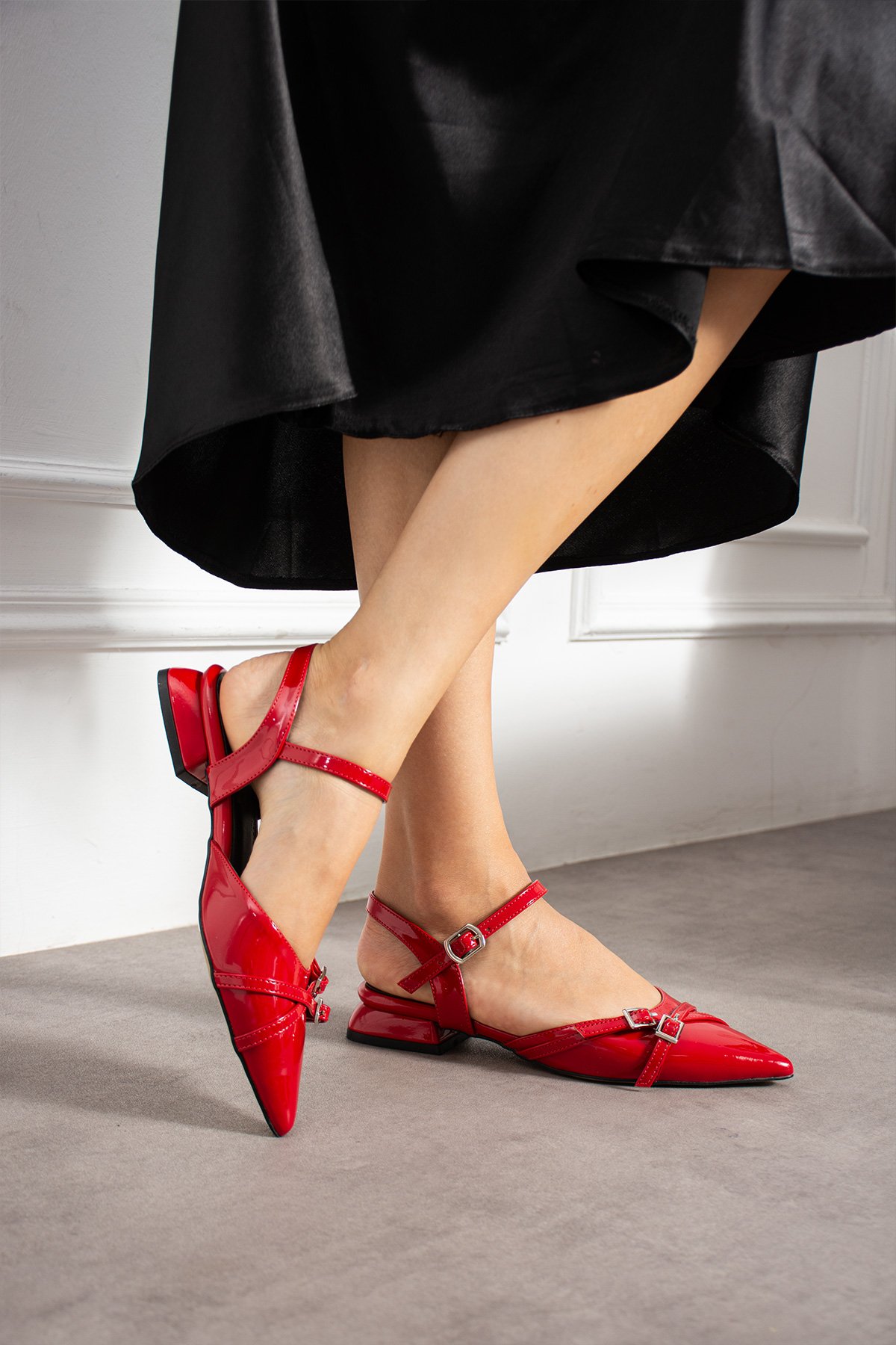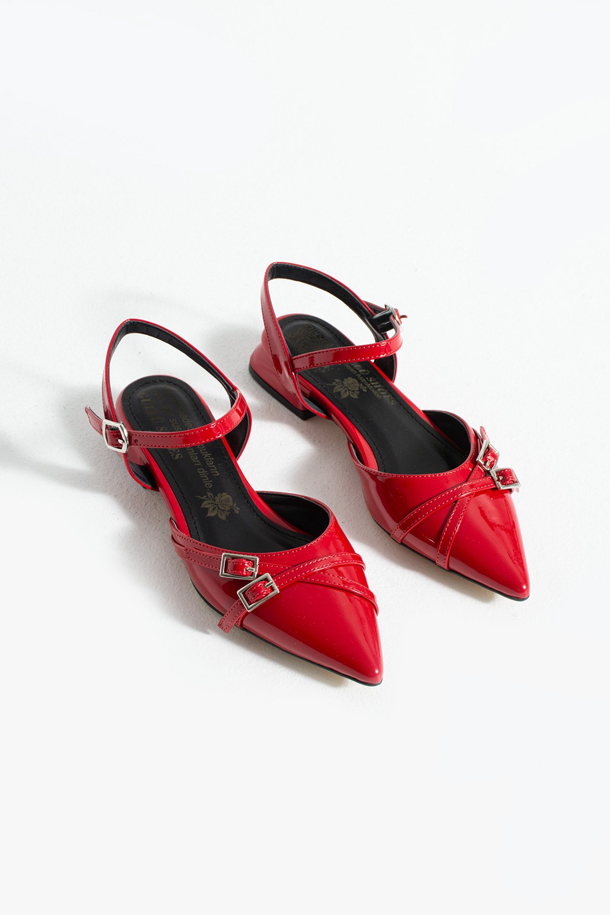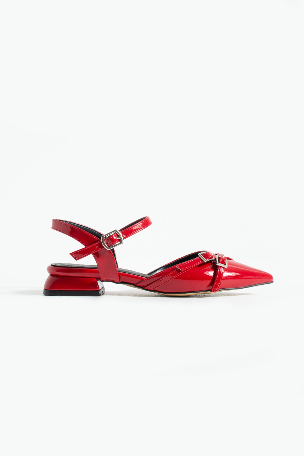 Kırmızı Rugan Bilekten Bağlamalı Çift Tokalı Sivri Burun Düşük Topuk Kadın Ayakkabı