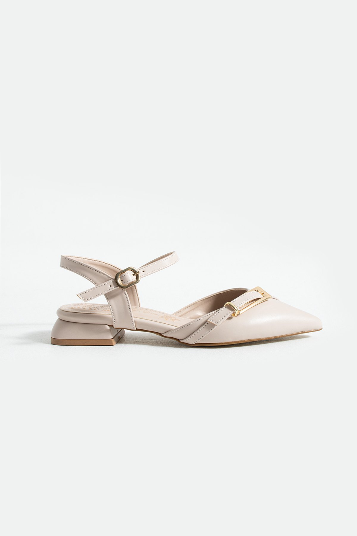 Krem Mat Altın Tokalı Bilekten Bağlamalı Sivri Burun Düşük Blok Topuk Kadın Babet Ayakkabı