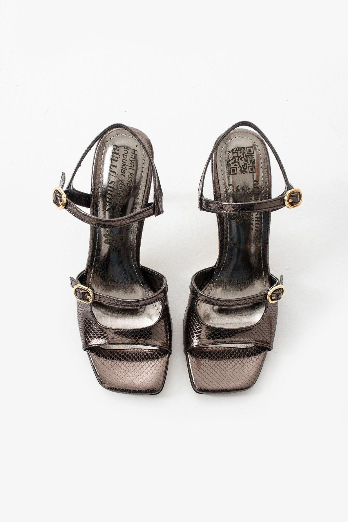 Metalik Füme Yılan Desenli Yazlık Şık Ortapedik Kaymaz Tabanlı Vegan Topuklu Sandalet