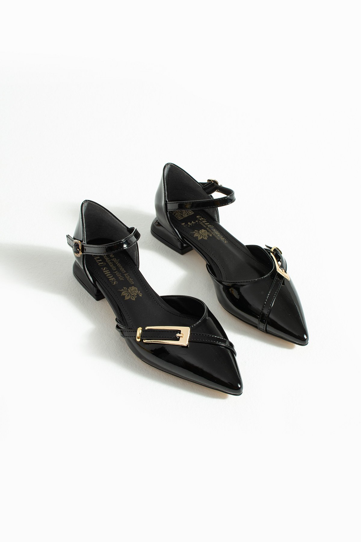 Siyah Rugan Bilekten Bağlamalı Altın Tokalı Sivri Burun Düşük Topuk Kadın Babet Ayakkabı