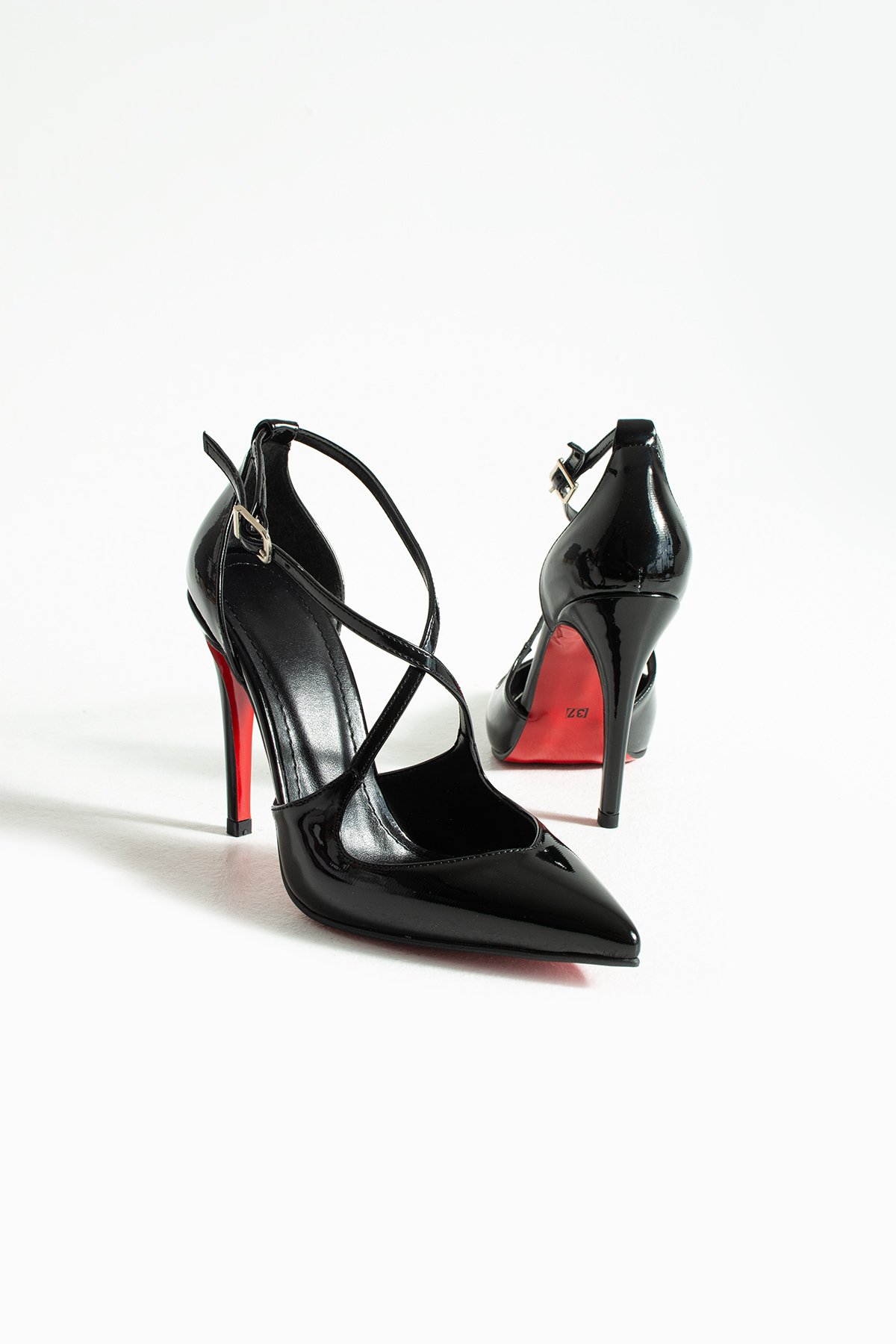 Siyah rugan çapraz bantlı stiletto, 9 cm ince topuğu ve sivri burun tasarımıyla zarifliğin en güçlü sembolüdür. Parlak rugan yüzeyi feminen bir şıklık sunarken, hafızalı ped destekli iç tabanı uzun süreli kullanımda konfor sağlar. Özel davetlerde, abiye kombinlerde ve ofis stilinde zamansız bir tamamlayıcıdır.