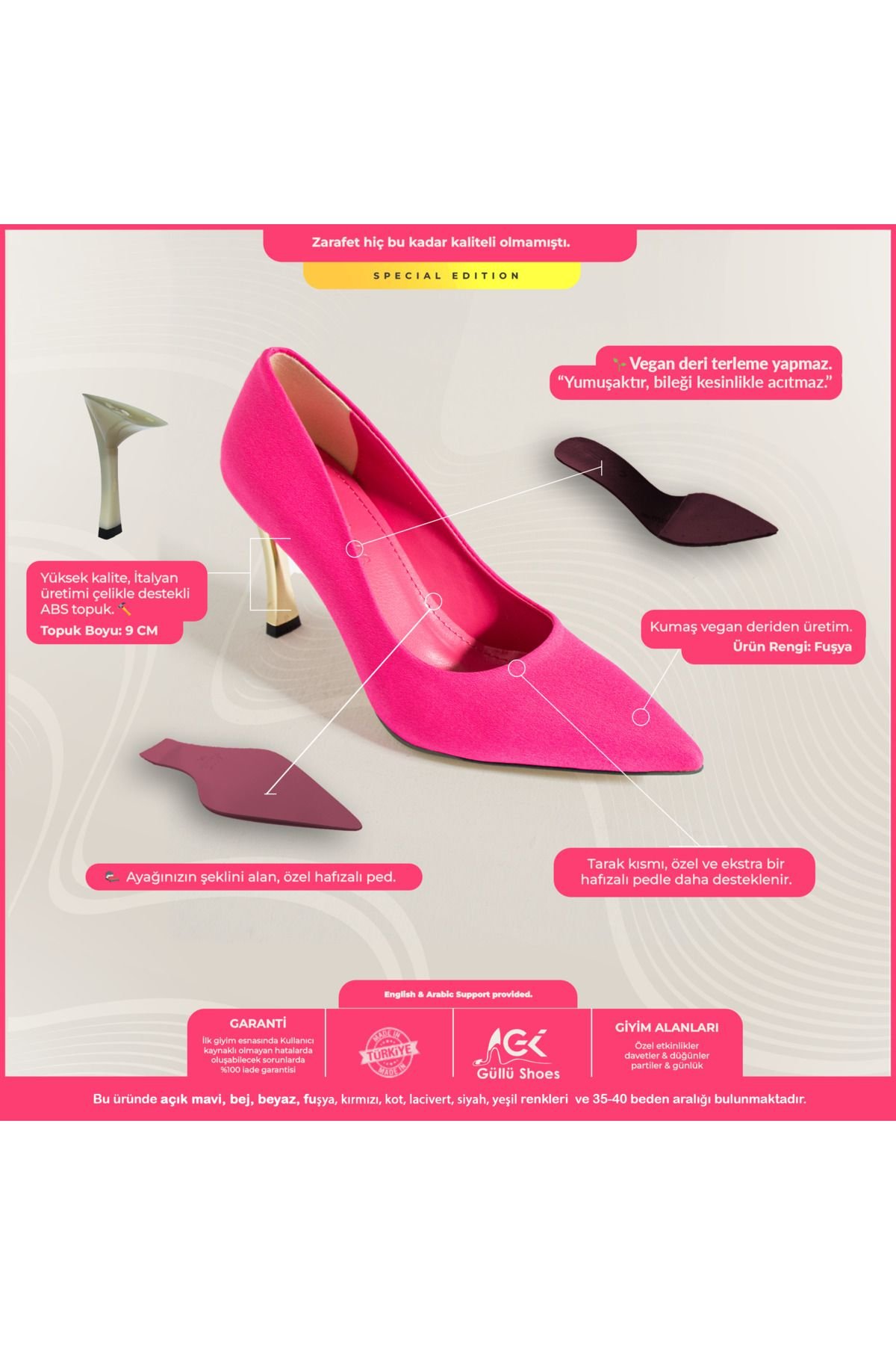 Stiletto Topuklu Ayakkabı: İnce ve uzun topuk yapısı, şıklığı ve zarafeti bir arada sunar.; Kadın Abiye Ayakkabı: Düğün, davet ve özel gecelerde şıklığınızı tamamlar.; Kumaş Kaplama: Şık ve zarif bir görünüm sunar, hem abiye hem de günlük kombinler için ideal bir seçimdir.; Vegan Deri Ayakkabı: Çevreye duyarlı kadınlar için doğa dostu malzemelerden üretilmiştir.; Günlük Topuklu Ayakkabı: Rahat yapısı sayesinde gün boyu konfor sağlar, şıklığından ödün vermeden kullanabilirsiniz.; Düğün Ayakkabısı: Özel günlerinizde, zarif duruşu ve rahat yapısıyla size eşlik eder.; Fuşya Kadın Stiletto: Her kıyafetle uyumlu, çok yönlü bir ayakkabı olarak gardırobunuzun vazgeçilmezi olur.; Topuk Yüksekliği: 9 cm.; Fuşya stiletto, kadın modasında zamansız bir klasik olarak kabul edilen ve her kadının gardırobunda mutlaka bulunması gereken bir stiletto topuklu ayakkabı modelidir.; Bu fuşya stiletto, zarif bir duruş sağlarken, ince topukları sayesinde kadınların ayaklarını daha uzun ve ince gösterir.; Kadın abiye ayakkabı kategorisinde, özellikle fuşya stiletto modelleri, hem şıklığı hem de rahatlığı bir arada sunarak özel gecelerde, davetlerde ve düğünlerde kadınların ilk tercihi olmaktadır.; Abiye topuklu ayakkabı arayışında olanlar için ideal bir seçenek olan bu fuşya kadın stiletto, kombinlerinizi tamamlayarak göz alıcı bir görünüm elde etmenizi sağlar.; Stiletto topuklu ayakkabı, özellikle abiye ve günlük kombinlerde sıkça tercih edilen bir modeldir.; Fuşya kadın stiletto, rugan kaplaması ile dikkat çekerken, parlaklığı ve lüks görünümüyle abiye topuklu ayakkabı arayan kadınlar için vazgeçilmez bir alternatiftir.; Fuşya topuklu ayakkabı, her türlü kıyafetle uyum sağlayan çok yönlü bir seçenek sunarken, vegan deri ayakkabı özelliği sayesinde çevreye duyarlı kadınların da tercihi olmaktadır.; Vegan deri ayakkabı arayanlar için özel olarak tasarlanmış bu fuşya stiletto, zarafeti ve doğa dostu olmayı bir arada sunar.; Kadın stiletto denildiğinde akla ilk gelen bu model, düğün ayakkabısı olarak da mükemmel bir tercih sunar.; Düğün gibi özel günlerde, hem şıklığı hem de rahatlığı bir arada sunan bu abiye topuklu ayakkabı, gün boyu rahatlıkla kullanılabilecek bir tasarıma sahiptir.; Rugan ayakkabı kaplaması, fuşya stilettoya ekstra bir parlaklık katarken, stiletto topuklu ayakkabı yapısı sayesinde zarif bir yürüyüş sağlar.; Fuşya kadın stiletto, hem abiye hem de günlük topuklu ayakkabı olarak kullanılabilecek kadar çok yönlüdür.; Bu fuşya topuklu ayakkabı, kadın abiye ayakkabı koleksiyonlarının vazgeçilmez bir parçası olarak, stil sahibi kadınların her zaman tercihi olmuştur.; Sonuç olarak, fuşya sitiletto, kadın stiletto modelleri arasında öne çıkan, şıklığı ve zarafeti bir arada sunan, vegan deri ayakkabı olarak da tercih edilebilecek, rugan ayakkabı parlaklığıyla dikkat çeken, abiye topuklu ayakkabı arayanlar için mükemmel bir seçenek sunan, günlük topuklu ayakkabı olarak da kullanılabilen, düğün ayakkabısı olarak harika bir tercih olan, fuşya kadın stiletto modelidir.; Fuşya topuklu ayakkabı, kadın sitiletto arayışında olanların mutlaka göz önünde bulundurması gereken bir modeldir ve bu stiletto topuklu ayakkabı, her kadının tarzını yansıtan, abiye ve günlük kombinlerde mükemmel uyumu sağlayan bir üründür.
