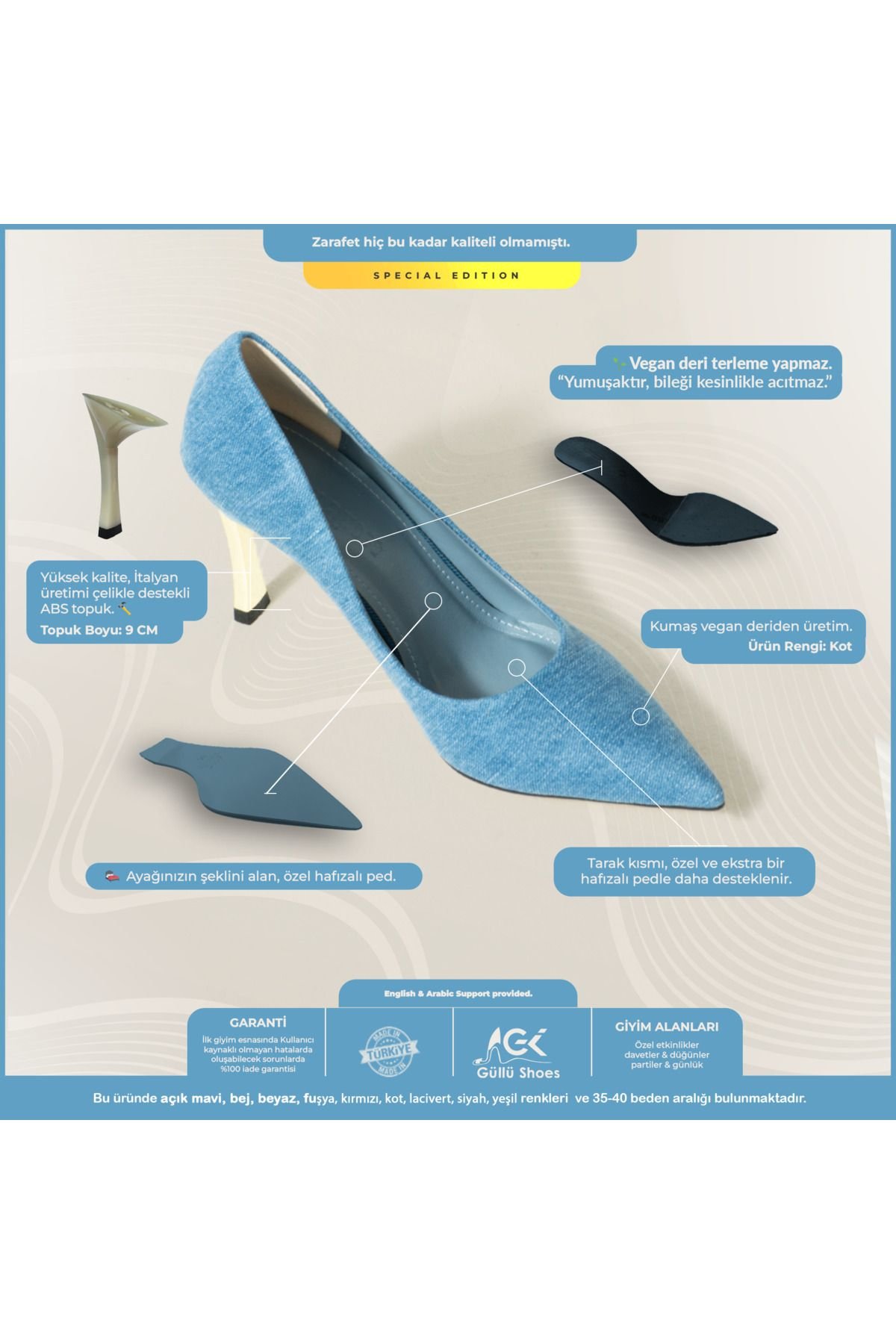 & Ücretsiz KargoStiletto Topuklu Ayakkabı:İnce ve uzun topuk yapısı, şıklığı ve zarafeti bir arada sunar.; Kadın Abiye Ayakkabı:Düğün, davet ve özel gecelerde şıklığınızı tamamlar.; Kot Kaplama:Şık ve zarif bir görünüm sunar, hem abiye hem de günlük kombinler için ideal bir seçimdir.; Vegan Deri Ayakkabı:Çevreye duyarlı kadınlar için doğa dostu malzemelerden üretilmiştir.; Günlük Topuklu Ayakkabı:Rahat yapısı sayesinde gün boyu konfor sağlar, şıklığından ödün vermeden kullanabilirsiniz.; Düğün Ayakkabısı:Özel günlerinizde, zarif duruşu ve rahat yapısıyla size eşlik eder.; Kot Kadın Stiletto:Her kıyafetle uyumlu, çok yönlü bir ayakkabı olarak gardırobunuzun vazgeçilmezi olur.; Topuk Yüksekliği:9Cm.; Kot stiletto, kadın modasında zamansız bir klasik olarak kabul edilen ve her kadının gardırobunda mutlaka bulunması gereken bir stiletto topuklu ayakkabı modelidir.; Bu kot stiletto, zarif bir duruş sağlarken, ince topukları sayesinde kadınların ayaklarını daha uzun ve ince gösterir.; Kadın abiye ayakkabı kategorisinde, özellikle kot stiletto modelleri, hem şıklığı hem de rahatlığı bir arada sunarak özel gecelerde, davetlerde ve düğünlerde kadınların ilk tercihi olmaktadır.; Abiye topuklu ayakkabı arayışında olanlar için ideal bir seçenek olan bu kot kadın stiletto, kombinlerinizi tamamlayarak göz alıcı bir görünüm elde etmenizi sağlar.; Stiletto topuklu ayakkabı, özellikle abiye ve günlük kombinlerde sıkça tercih edilen bir modeldir.; Kot kadın stiletto, rugan kaplaması ile dikkat çekerken, parlaklığı ve lüks görünümüyle abiye topuklu ayakkabı arayan kadınlar için vazgeçilmez bir alternatiftir.; Kot topuklu ayakkabı, her türlü kıyafetle uyum sağlayan çok yönlü bir seçenek sunarken, vegan deri ayakkabı özelliği sayesinde çevreye duyarlı kadınların da tercihi olmaktadır.; Vegan deri ayakkabı arayanlar için özel olarak tasarlanmış bu kot stiletto, zarafeti ve doğa dostu olmayı bir arada sunar.; Kadın stiletto denildiğinde akla ilk gelen bu model, düğün ayakkabısı olarak da mükemmel bir tercih sunar.; Düğün gibi özel günlerde, hem şıklığı hem de rahatlığı bir arada sunan bu abiye topuklu ayakkabı, gün boyu rahatlıkla kullanılabilecek bir tasarıma sahiptir.; Rugan ayakkabı kaplaması, kot stilettoya ekstra bir parlaklık katarken, stiletto topuklu ayakkabı yapısı sayesinde zarif bir yürüyüş sağlar.; Kot kadın stiletto, hem abiye hem de günlük topuklu ayakkabı olarak kullanılabilecek kadar çok yönlüdür.; Bu kot topuklu ayakkabı, kadın abiye ayakkabı koleksiyonlarının vazgeçilmez bir parçası olarak, stil sahibi kadınların her zaman tercihi olmuştur.; Sonuç olarak, kot stiletto, kadın sitiletto modelleri arasında öne çıkan, şıklığı ve zarafeti bir arada sunan, vegan deri ayakkabı olarak da tercih edilebilecek, rugan ayakkabı parlaklığıyla dikkat çeken, abiye topuklu ayakkabı arayanlar için mükemmel bir seçenek sunan, günlük topuklu ayakkabı olarak da kullanılabilen, düğün ayakkabısı olarak harika bir tercih olan, kot kadın sitiletto modelidir.; Kot topuklu ayakkabı, kadın sitiletto arayışında olanların mutlaka göz önünde bulundurması gereken bir modeldir ve bu sitiletto topuklu ayakkabı, her kadının tarzını yansıtan, abiye ve günlük kombinlerde mükemmel uyumu sağlayan bir üründür.