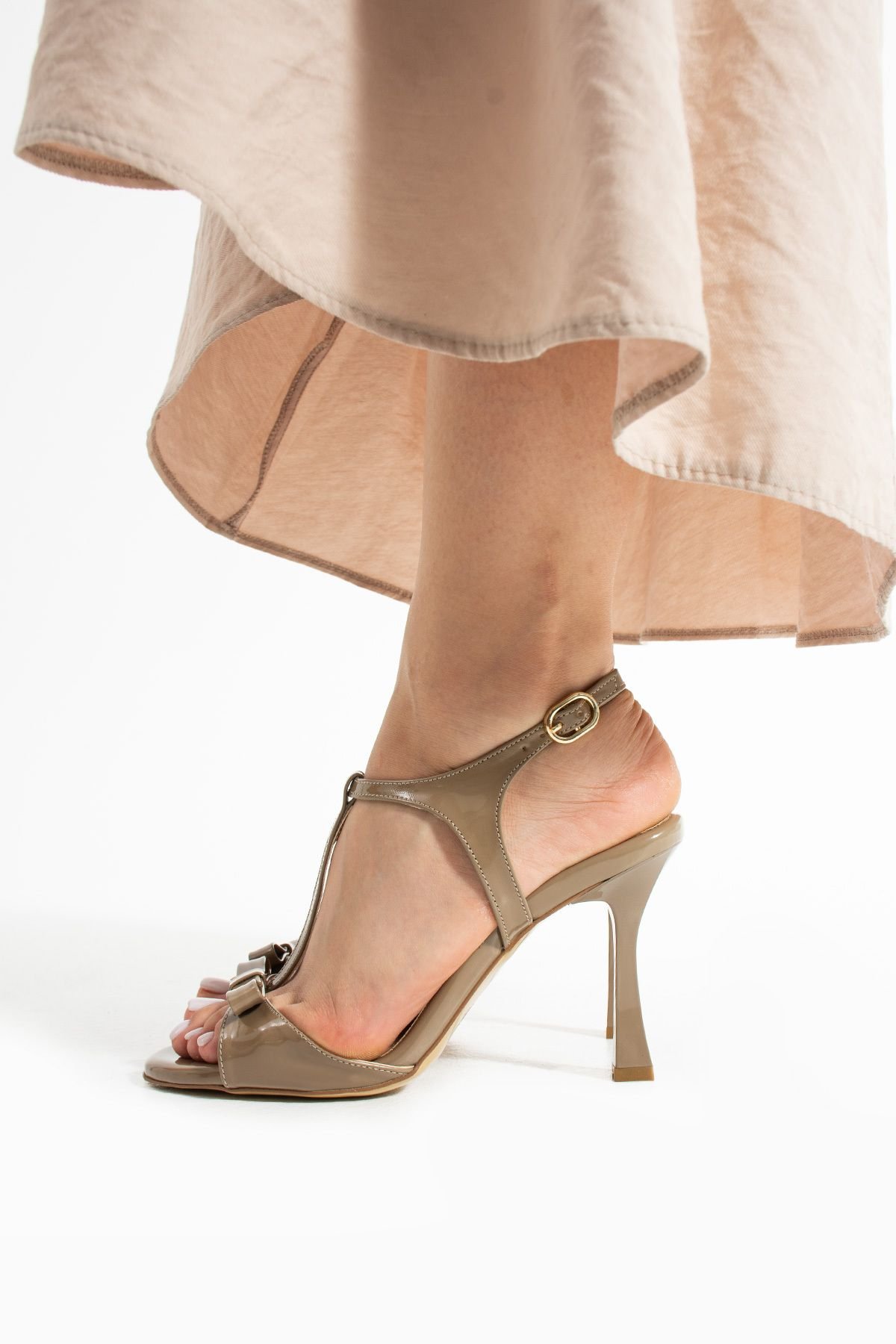 Topuk tipi: İnce ve orta yükseklikte (yaklaşık 9 cm) – hem dengeli hem de feminen bir duruş sağlar.